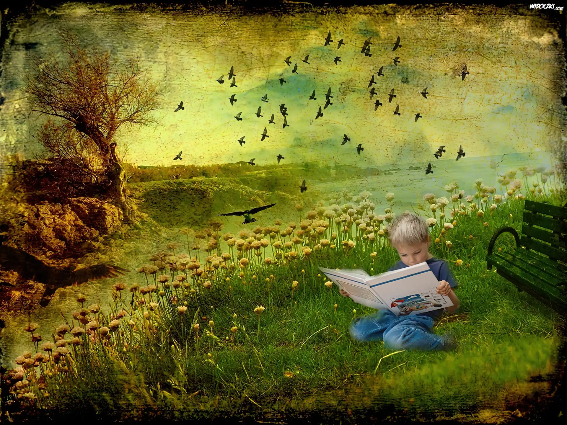 Zdjęcia, Park, Chłopiec, Z, Książką, Łąka