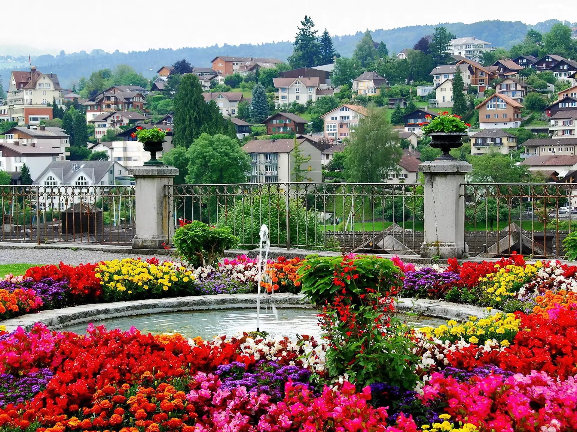 Zdjęcia, Park, Fontanna, Otoczona, Kwiatami, Miejscowość