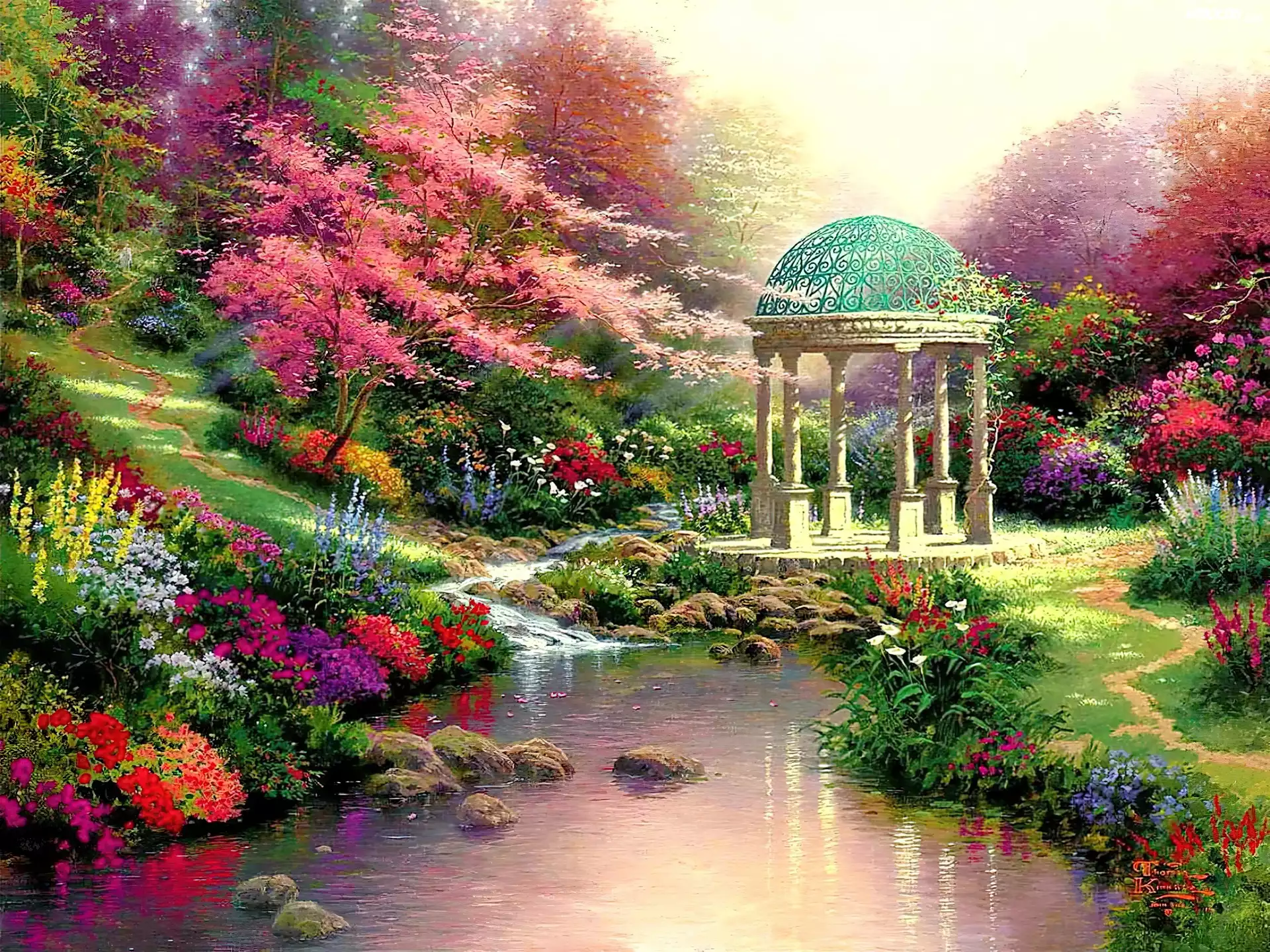 Zdjęcia, Park, Staw, Altana, Kwiaty, Drzewa