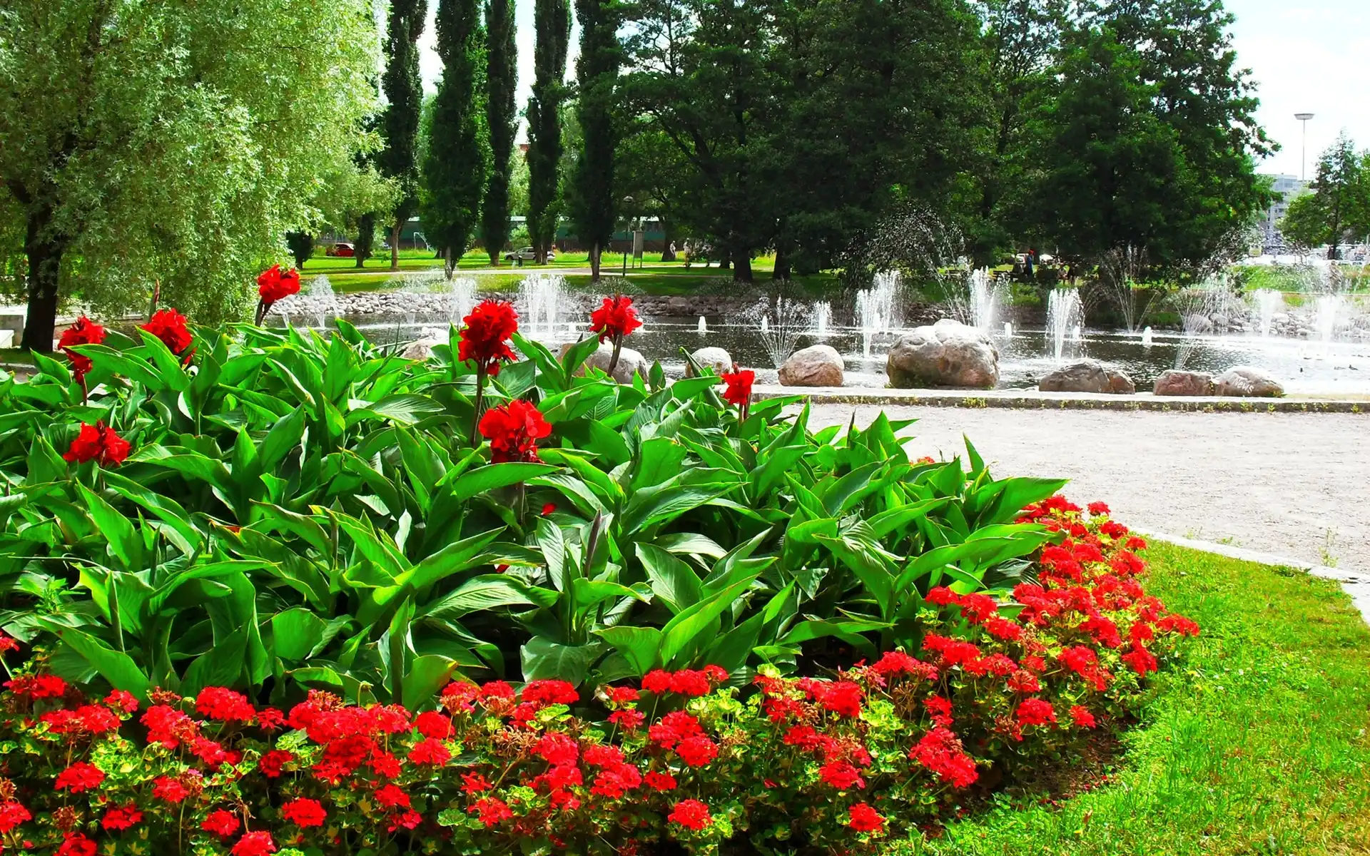 Park, Klomb, Czerwone, Kwiaty, Fontanna