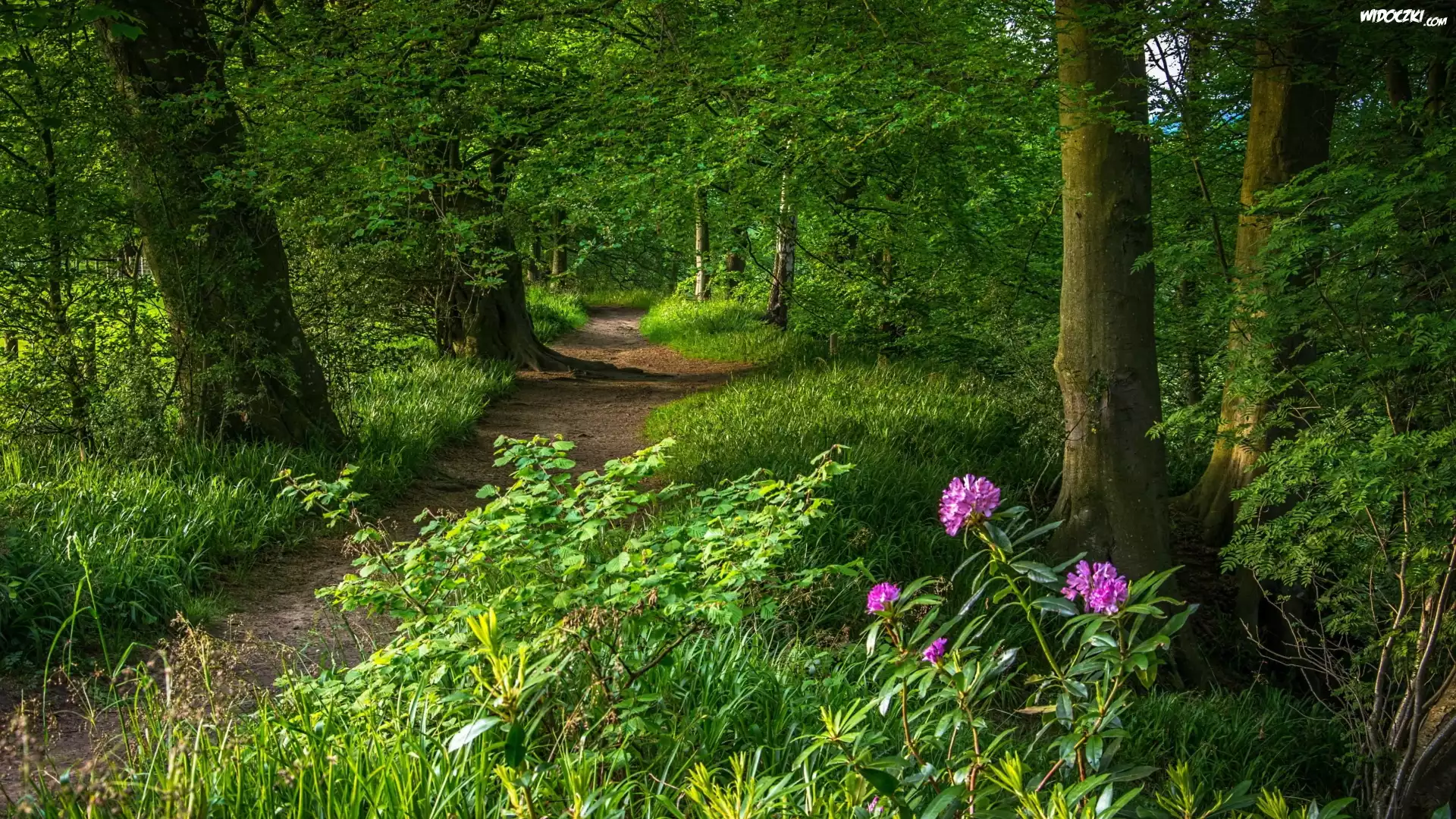 Zdjęcia, Park, Ścieżka, Drzewa, Rośliny, Kwiaty, Różanecznik