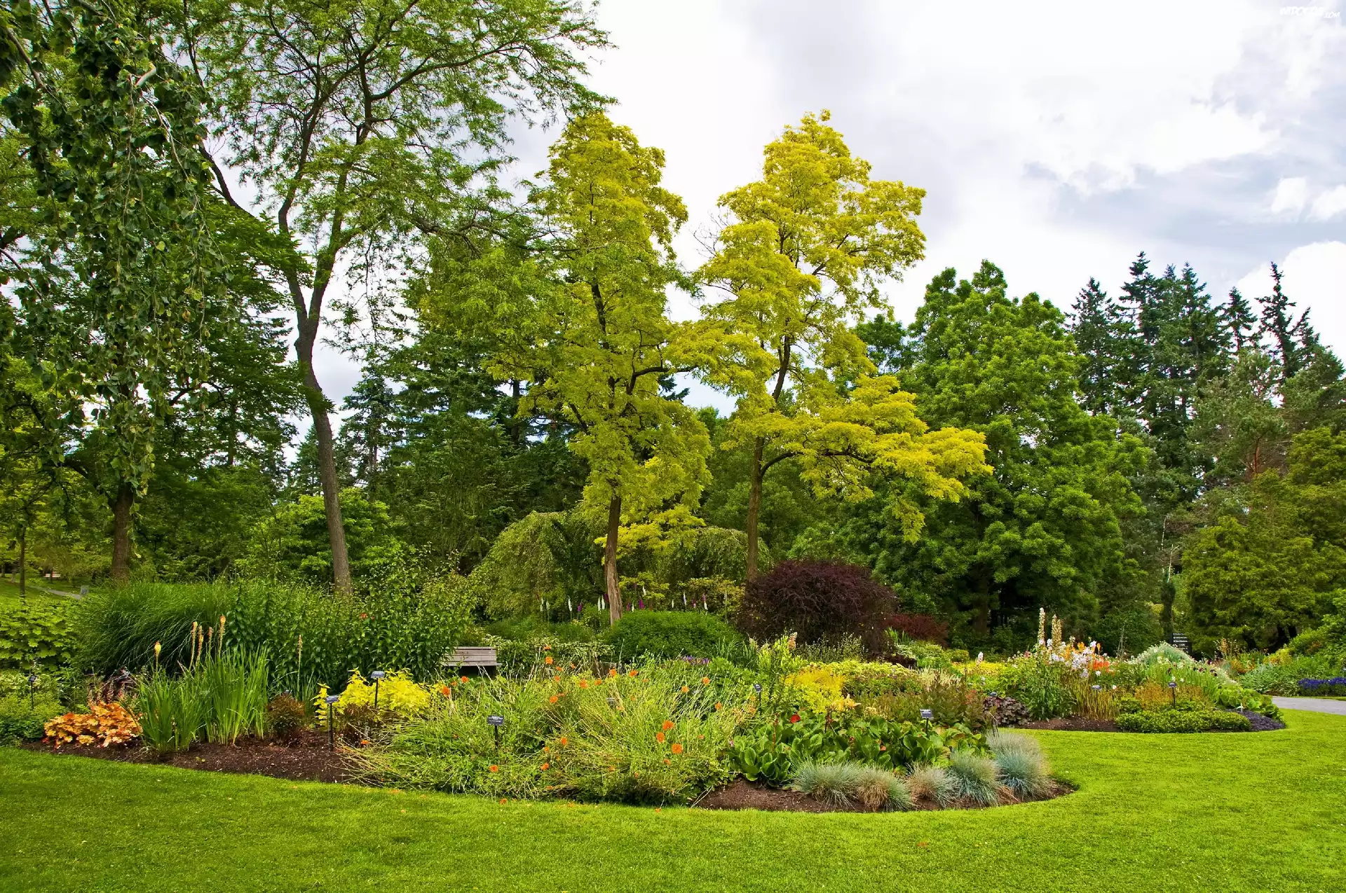 Zdjęcia, Park, Drzewa, Klomby, Kwiaty, Ławka