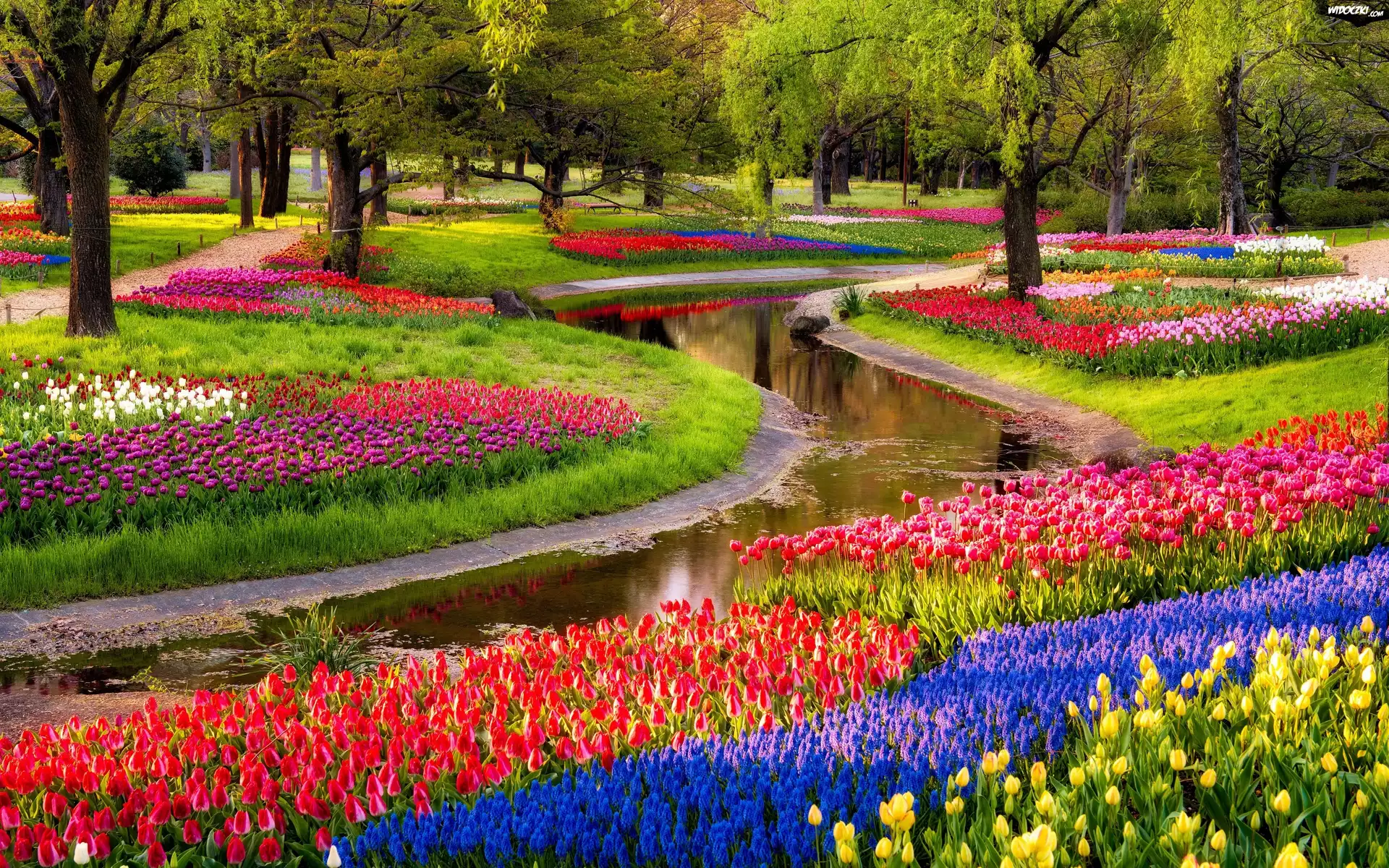 Zdjęcia, Park, Rzeczka, Kwiaty, Tulipany