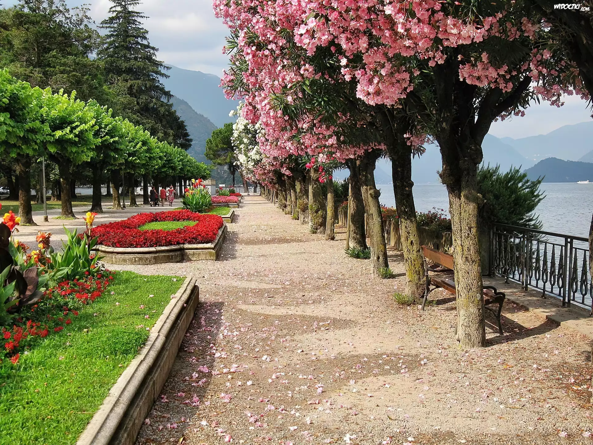 Zdjęcia, Park, Aleja, Klomby, Kwitnące, Drzewa