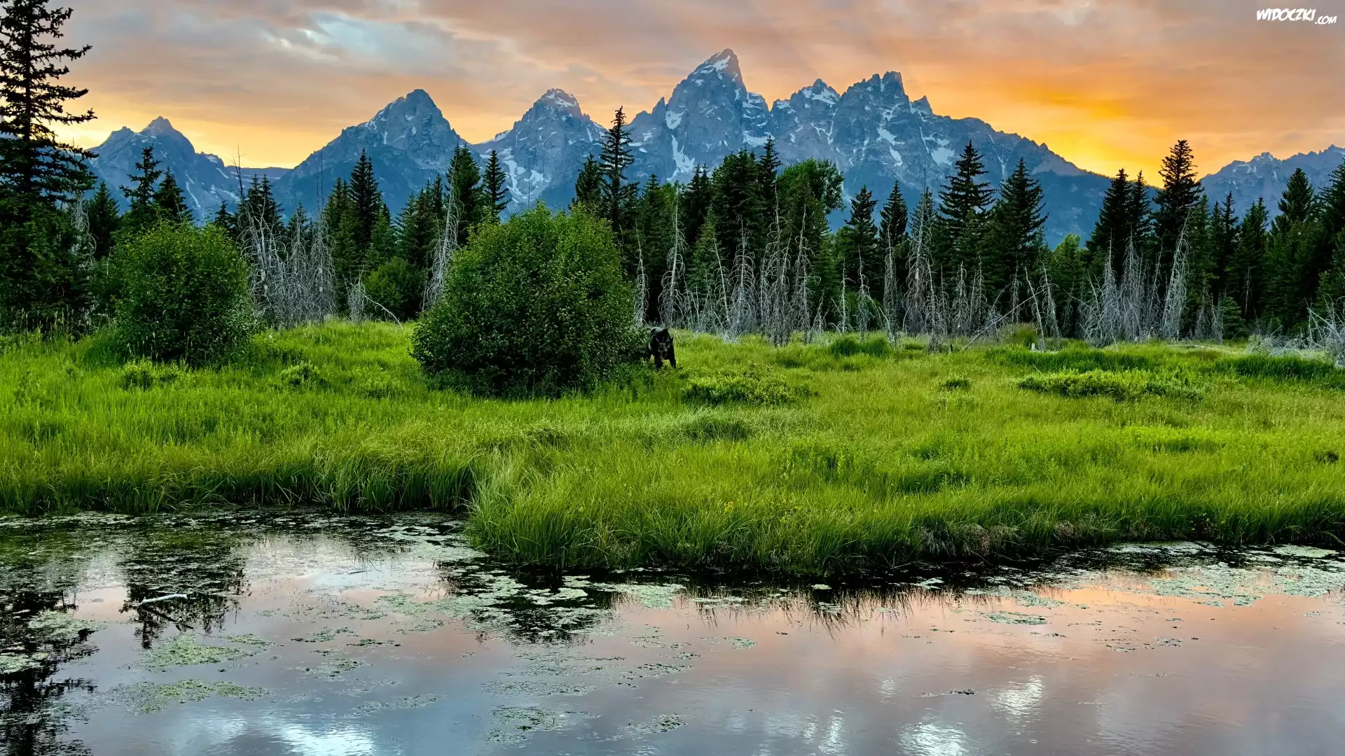 Zdjęcia, Stany Zjednoczone, Wyoming, Park Narodowy Grand Teton, Góry, Rzeka, Las, Drzewa, Zachód słońca