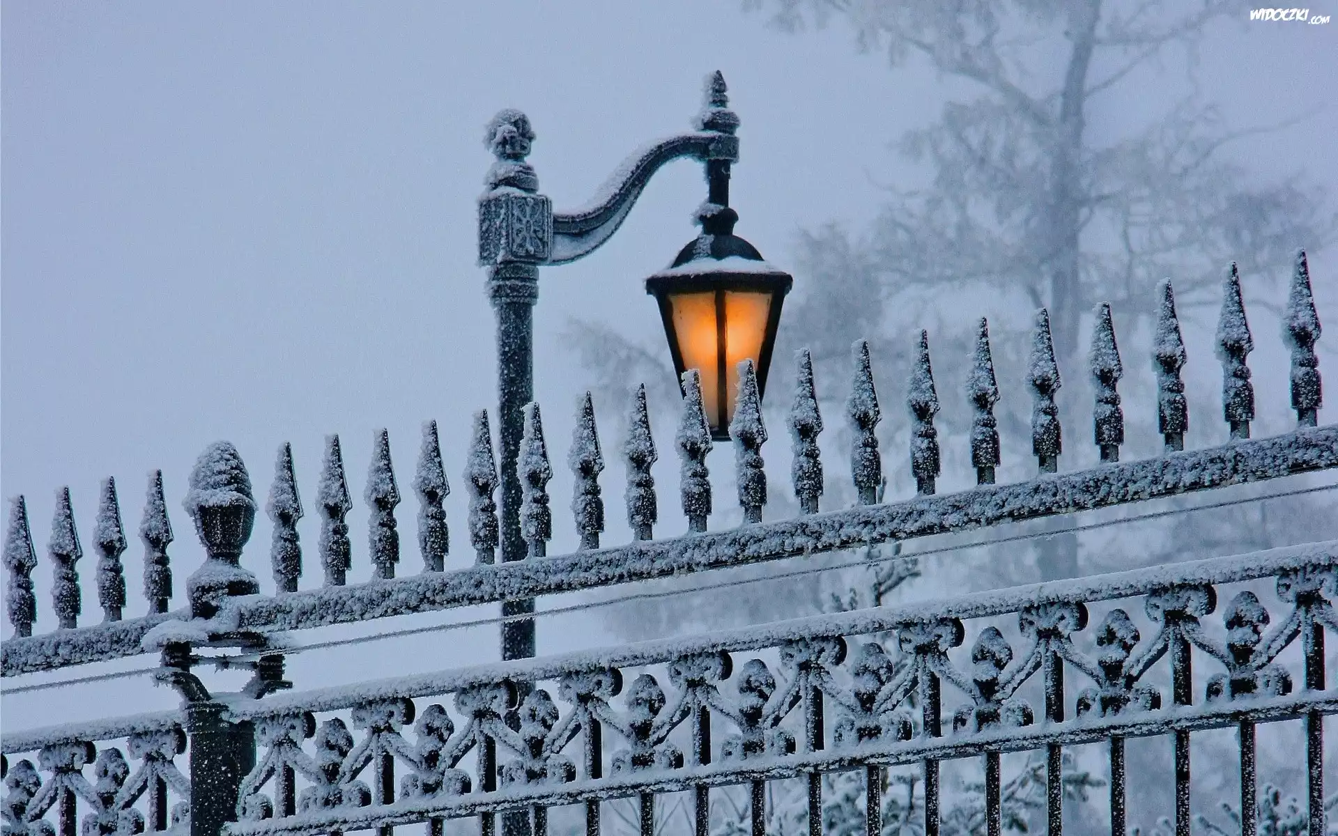 Zdj臋cia, Park, Drzewa, Ogrodzenie, Latarnia, Zima