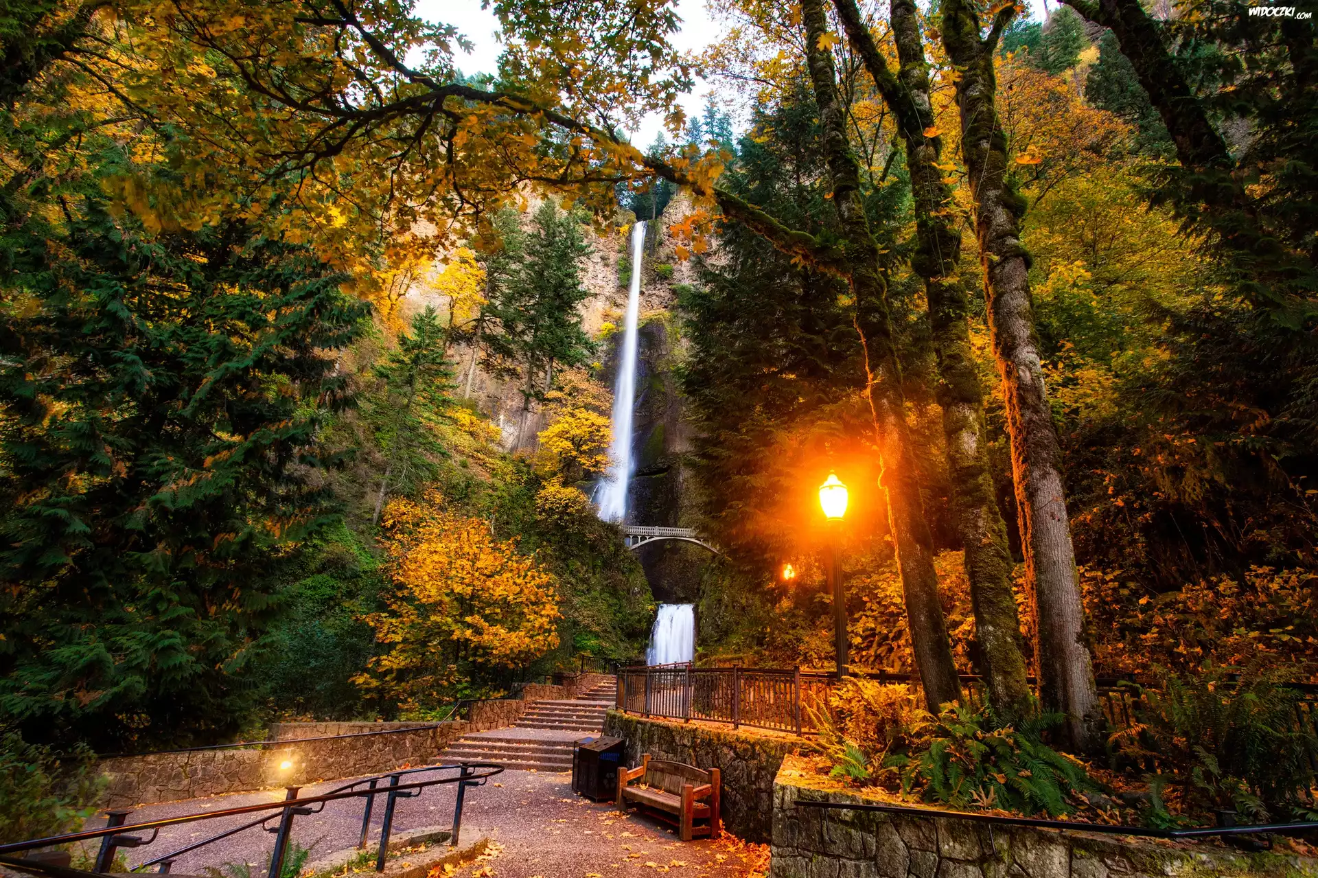 Zdjęcia, Park, Alejka, Wodospad, Latarnia, Ławka