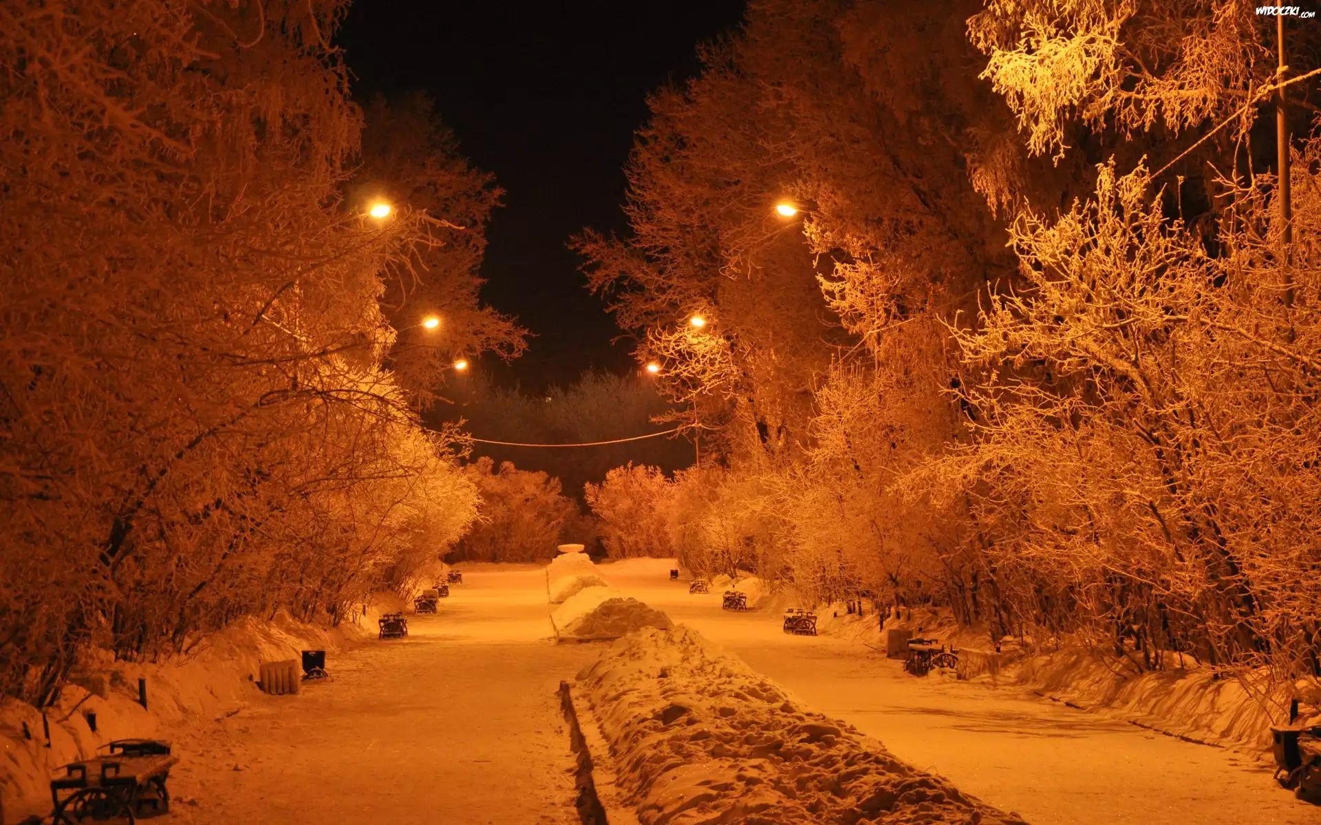 Park, Drzewa, Latarnie, Zima