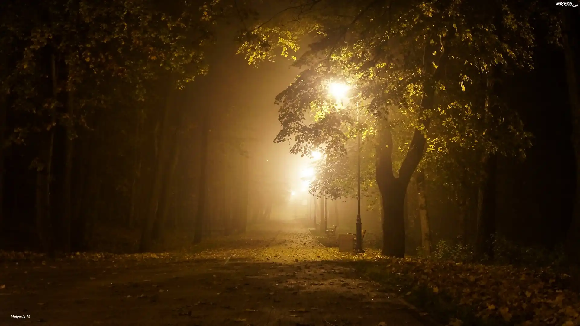 Zdjęcia, Park, Drzewa, Noc, Alejka, Latarnie, Mgła