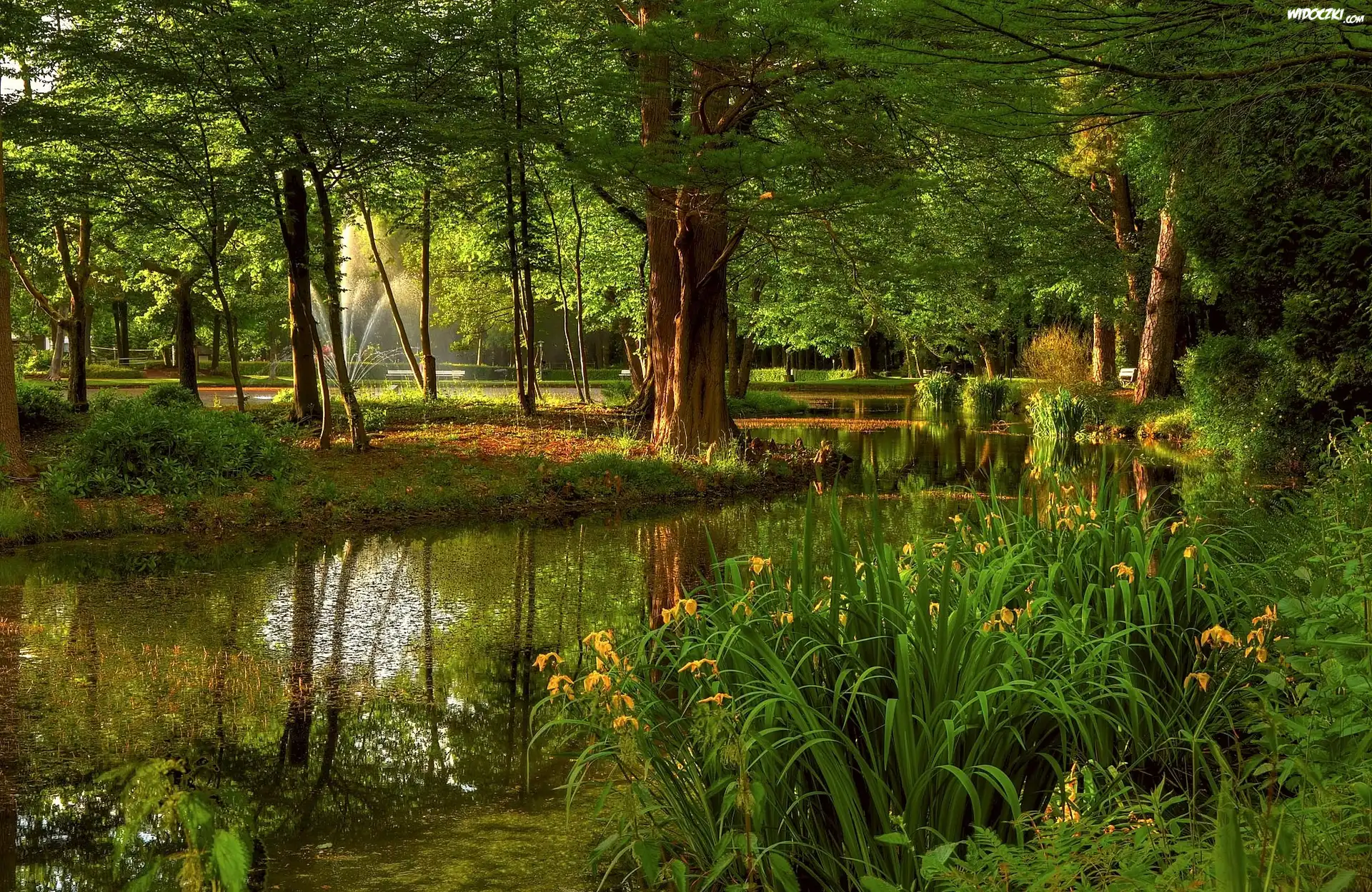 Park, Rzeczka, Fontanna, Lato, Drzewa