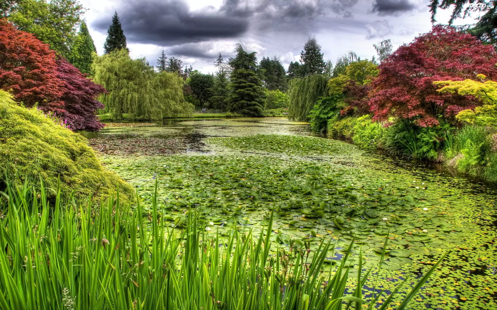Zdjęcia, Park, Drzewa, Lilie, Wodne, Staw