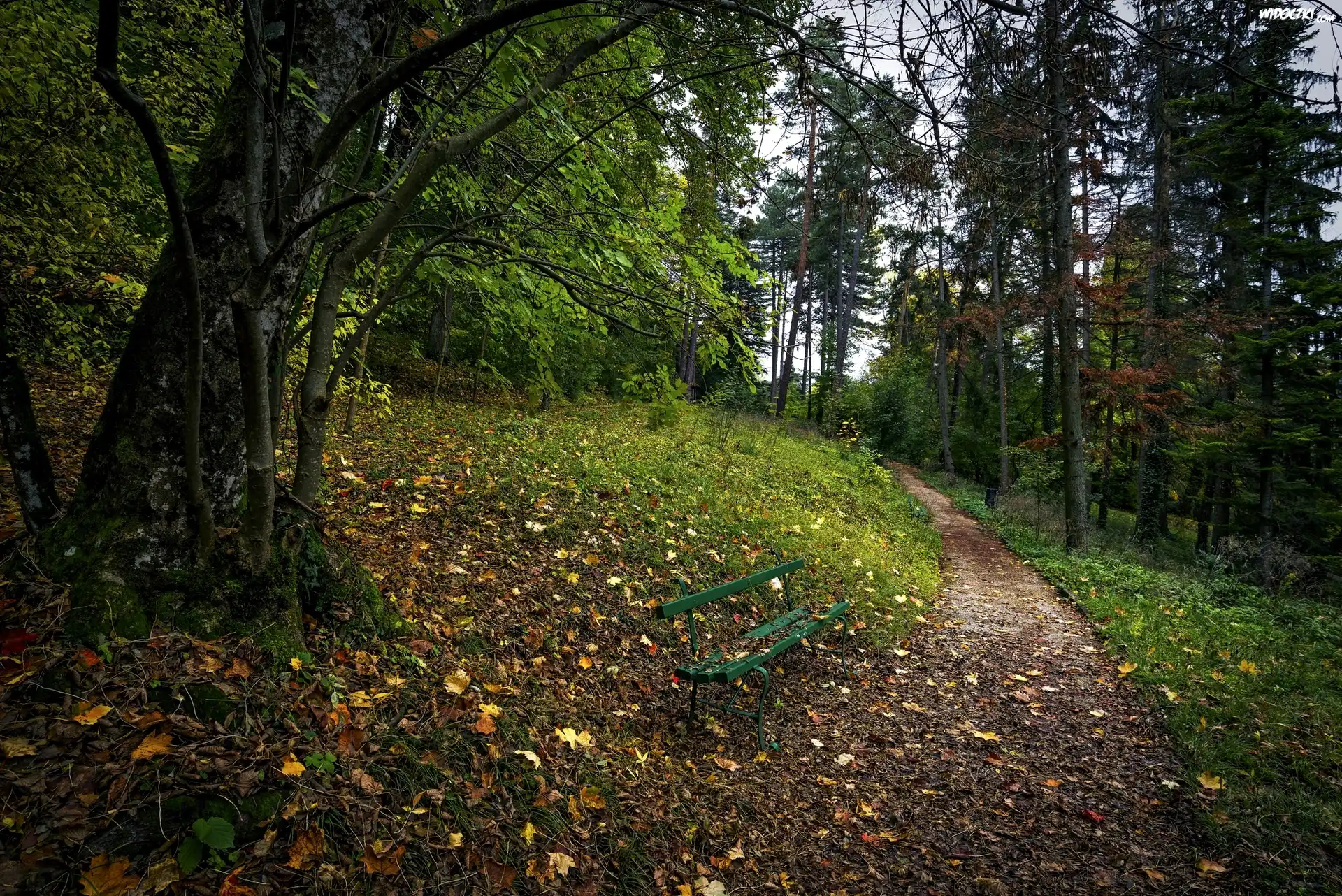 Zdjęcia, Park, Drzewa, Alejka, Liście, Ławka