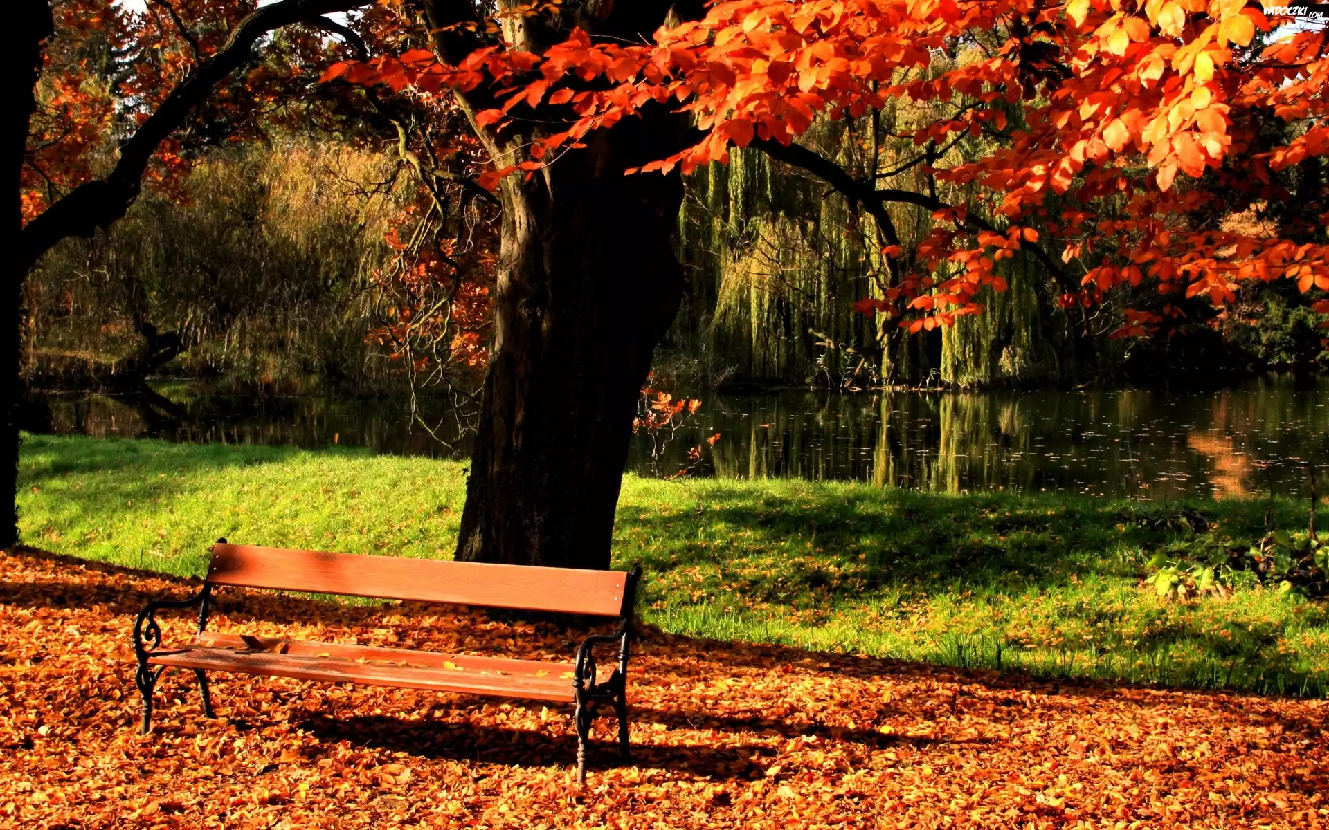 Zdjęcia, Park, Rzeka, Ławka, Liście, Jesień