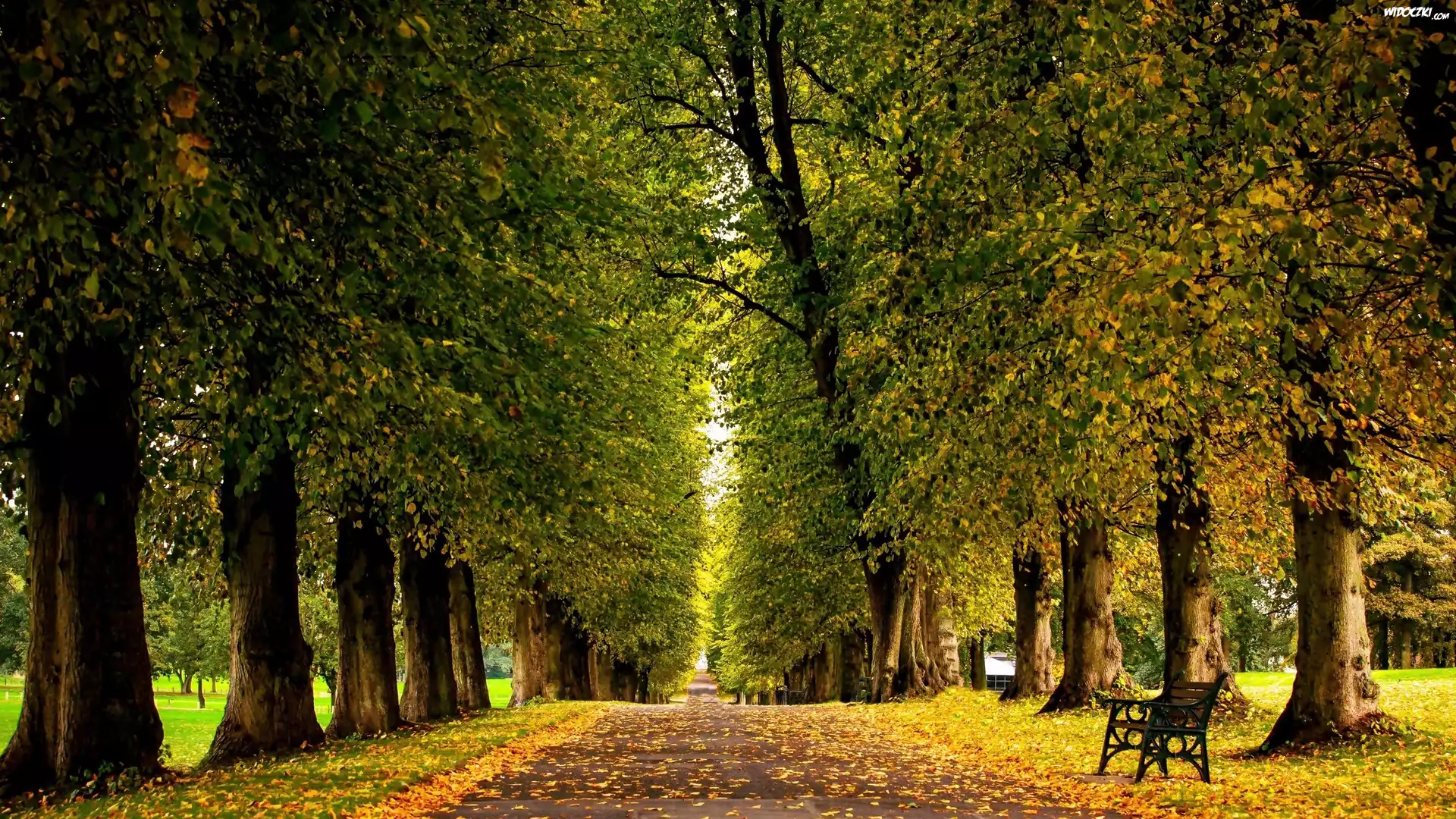 Zdjęcia, Park, Droga, Ławki, Drzewa, Liście, Jesień