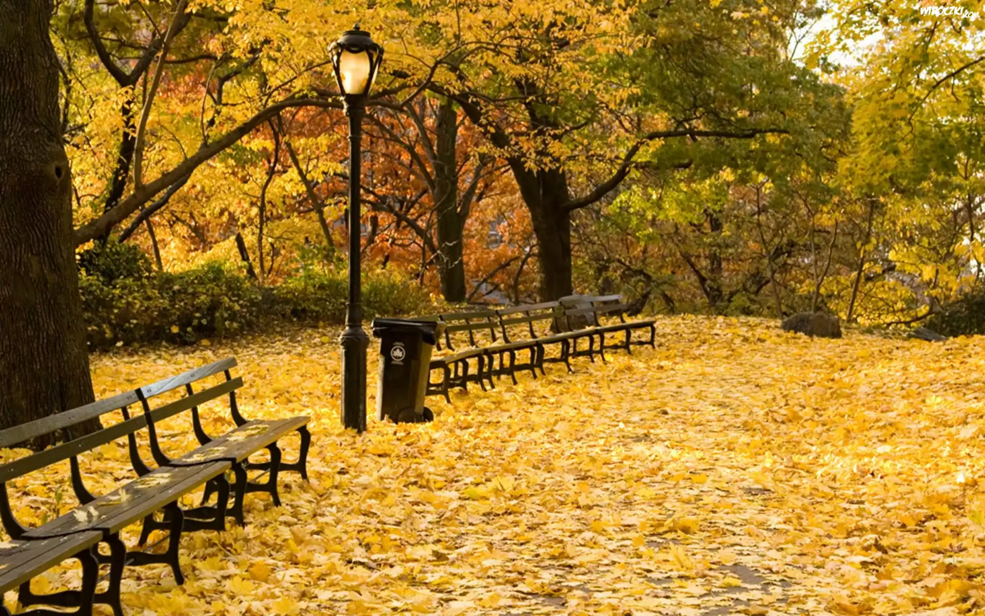 Zdjęcia, Park, Ławki, Liście, Jesień