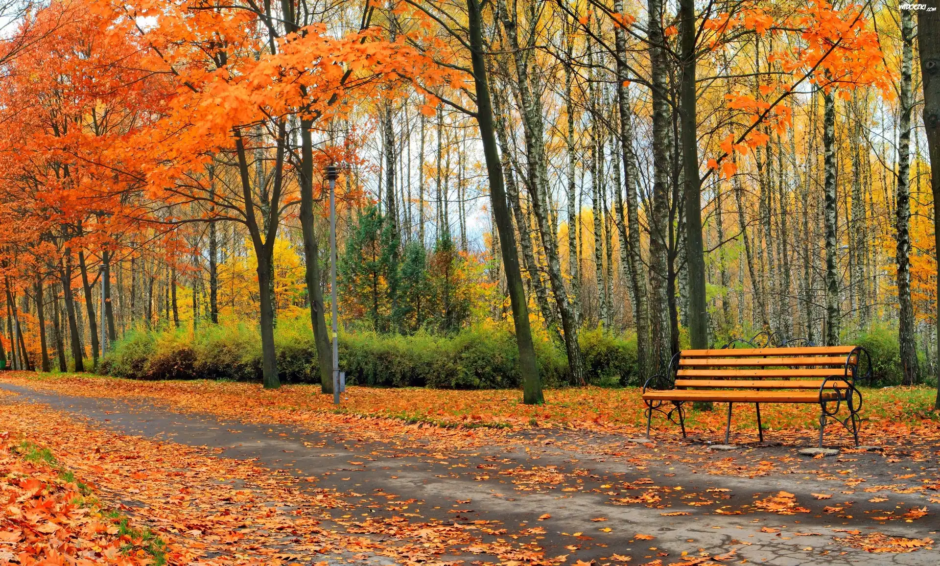 Zdjęcia, Park, Droga, Drzewa, Ławka, Liście, Jesień