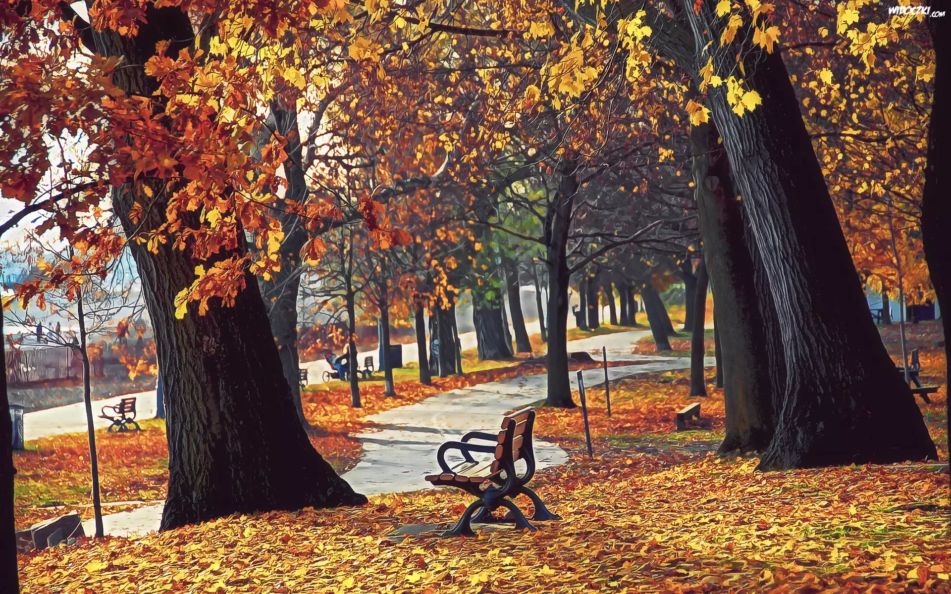 Zdjęcia, Park, Ławeczki, Opadłe, Liście, Rozmycie