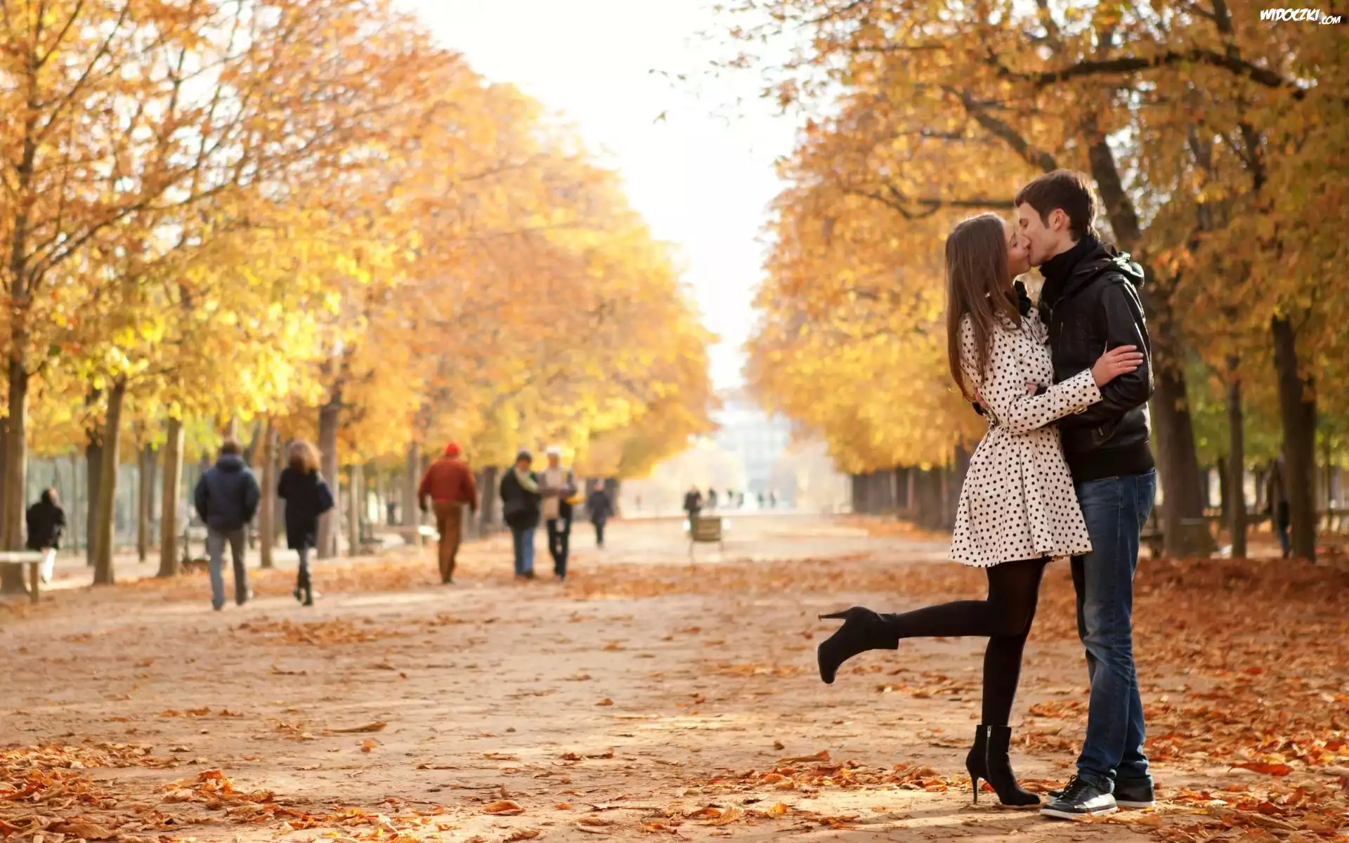 Zdjęcia, Park, Alejka, Liście, Kobieta, Mężczyzna, Pocalunek