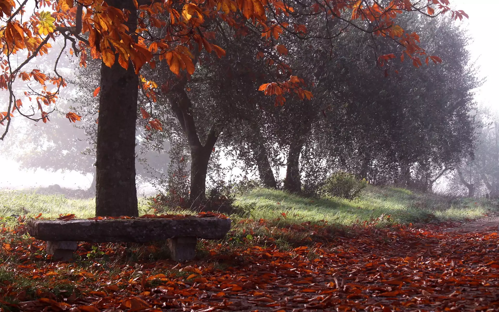 Park, Drzewa, Droga, Mgła, Jesień