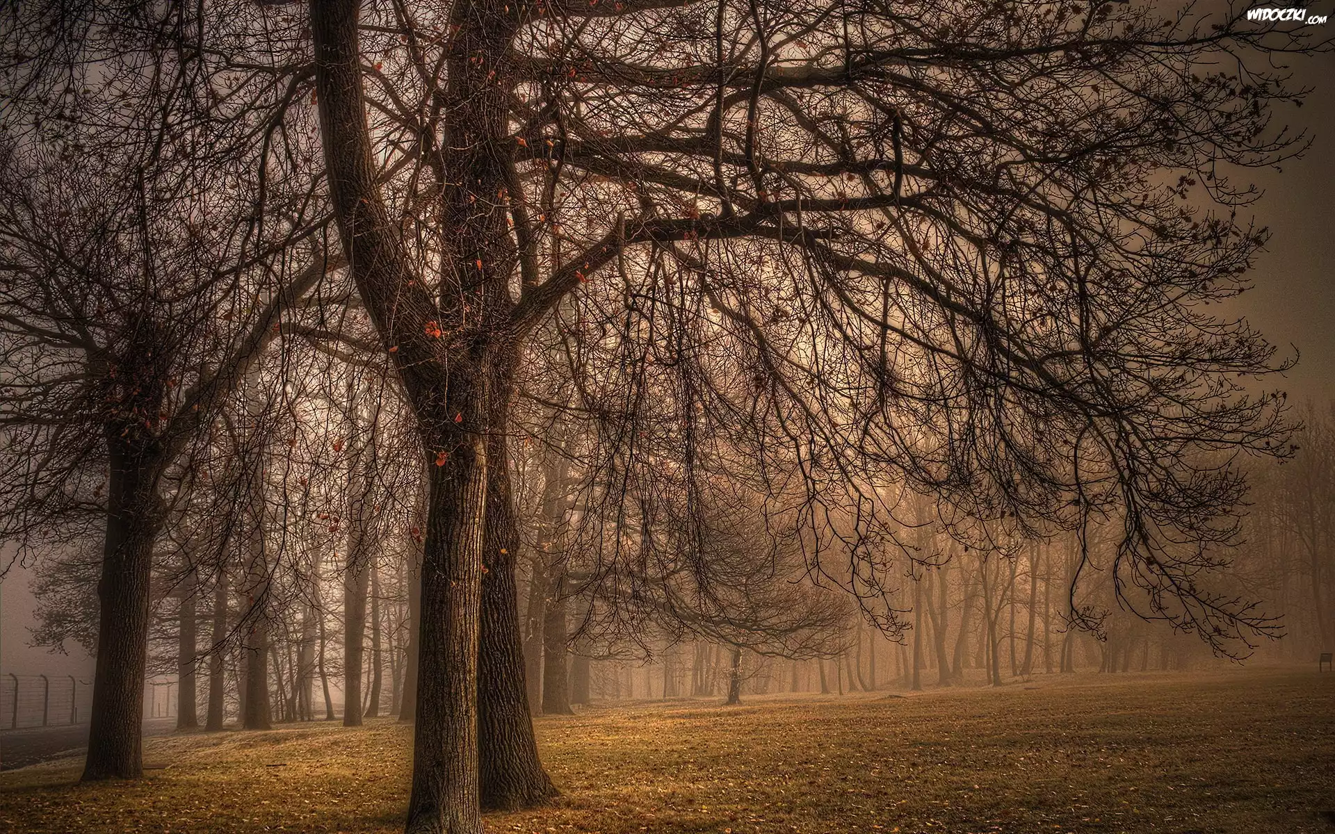 Zdjęcia, Park, Drzewa, Liście, Mgła, Jesień