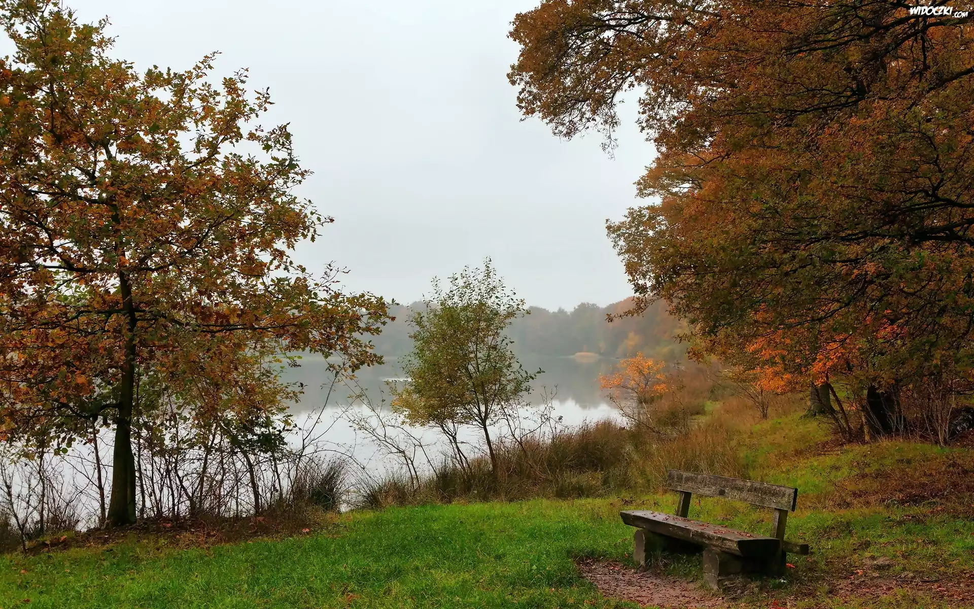 Zdjęcia, Park, Rzeka, Mgła, Ławeczka