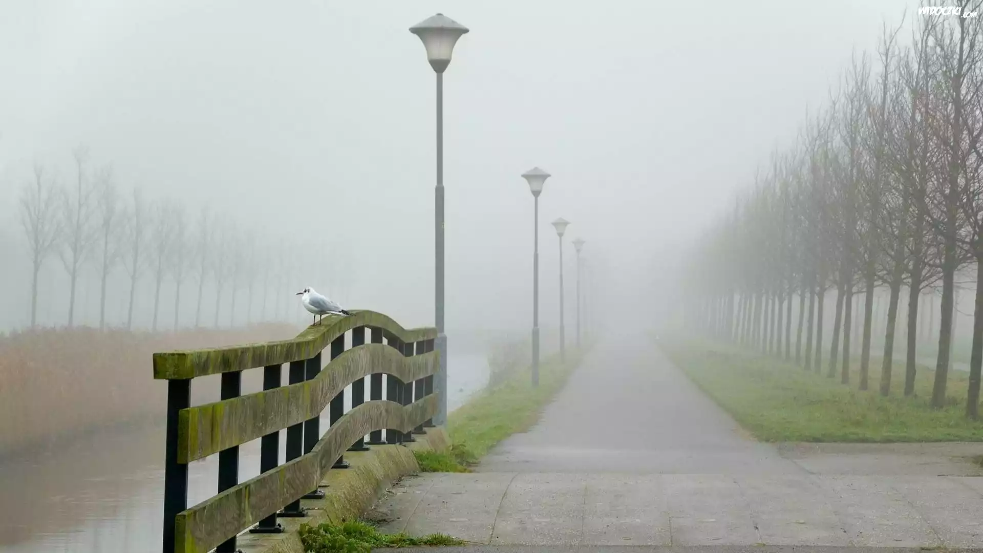 Zdjęcia, Park, Drzewa, Rzeka, Mgła, Mewa