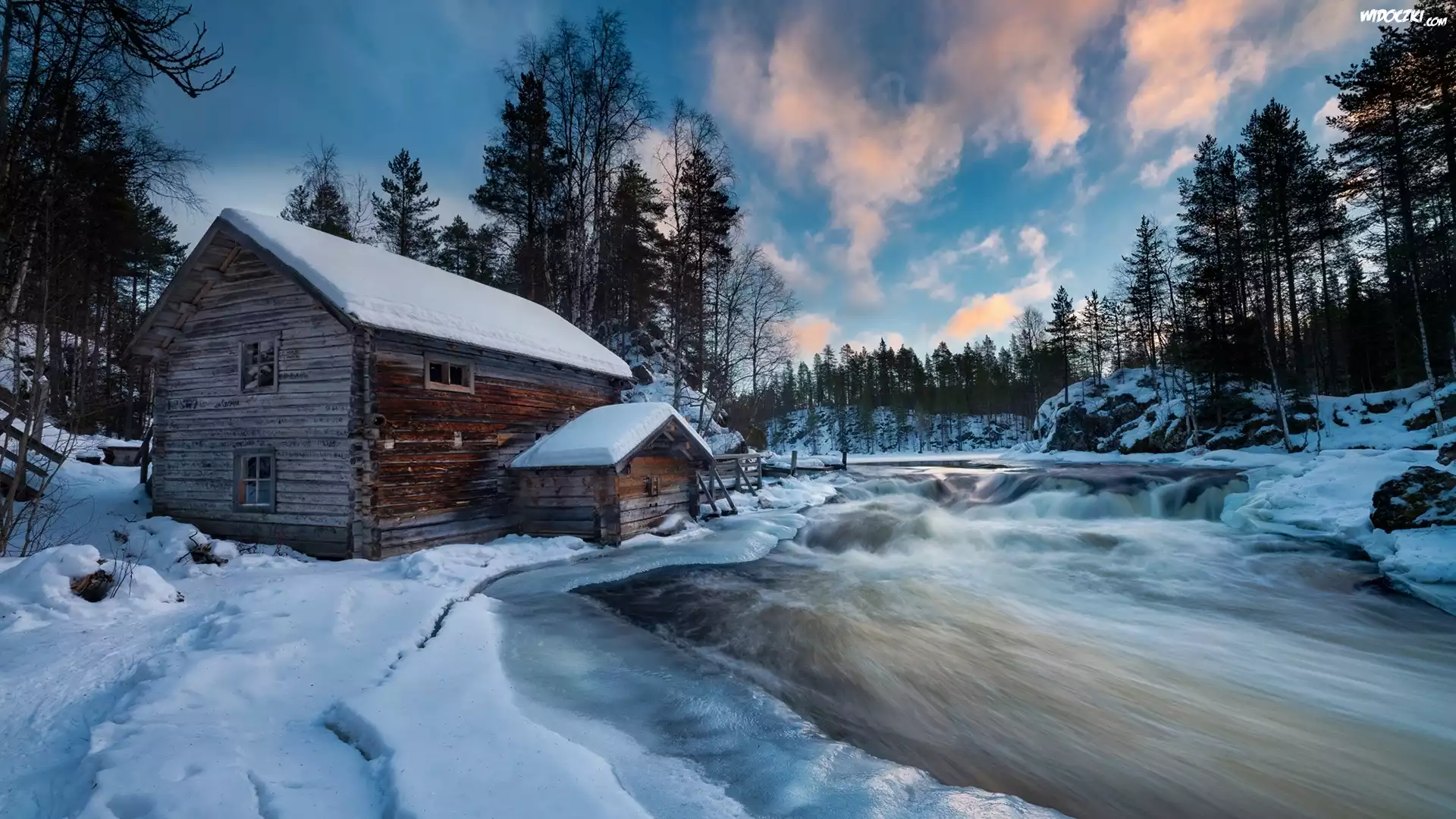 Zdjęcia, Młyn Myllykoski, Rzeka, Drzewa, Zima, Park Narodowy Oulanka, Gmina Kuusamo, Laponia, Finlandia