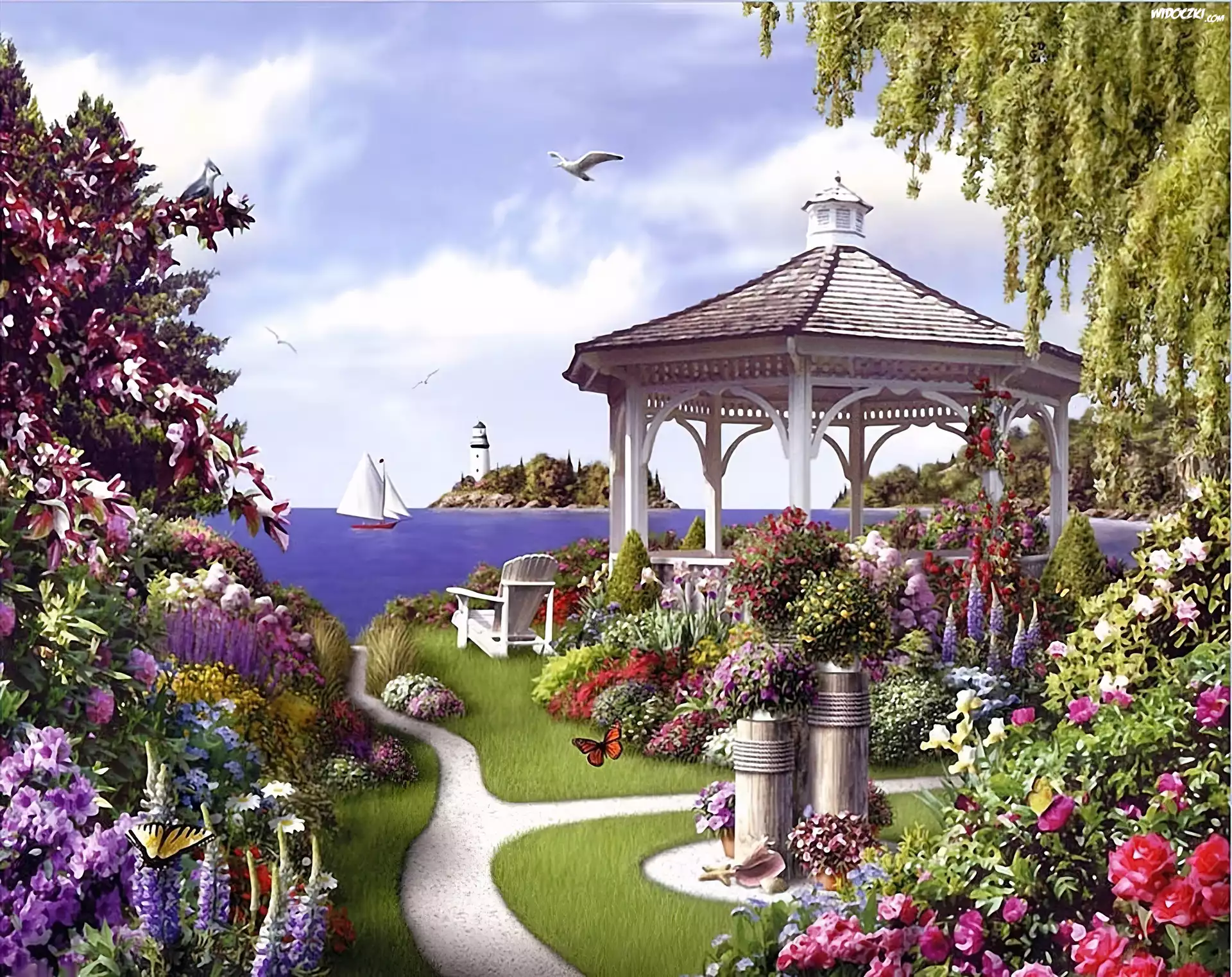 Zdjęcia, Park, Altana, Morze, Kwiaty