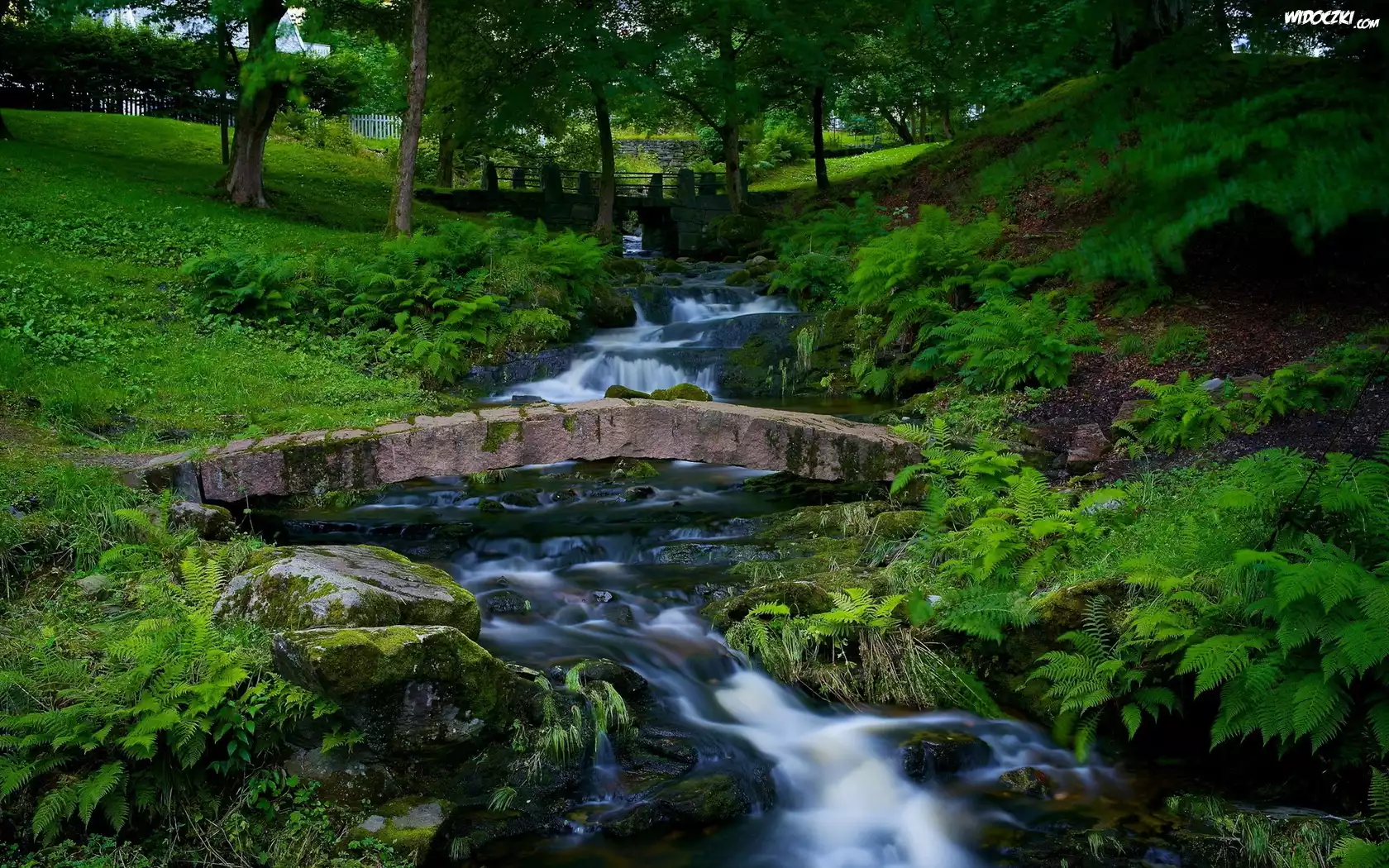 Zdjęcia, Park, Rzeczka, Paprocie, Mostek, Drzewa
