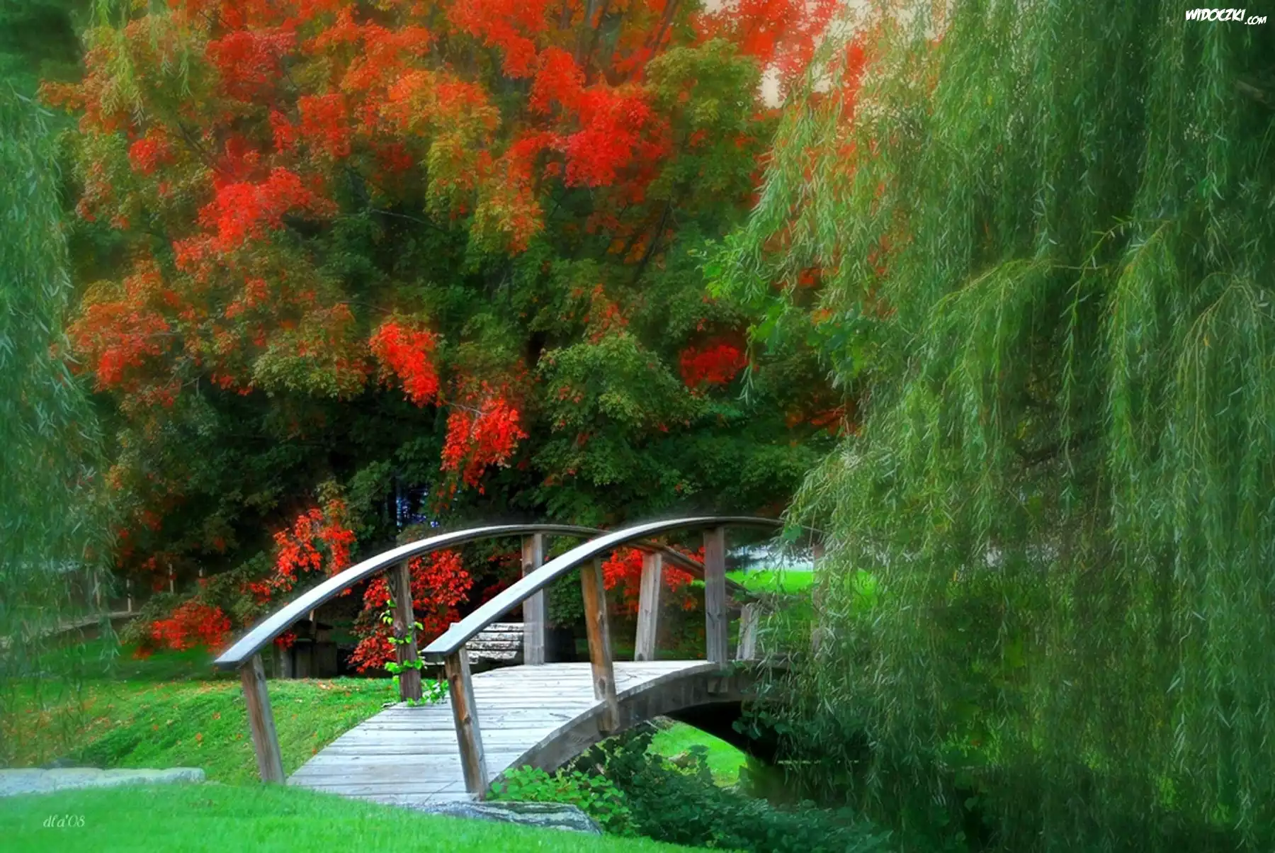 Zdj臋cia, Park, Wierzba, Mostek, Grafika