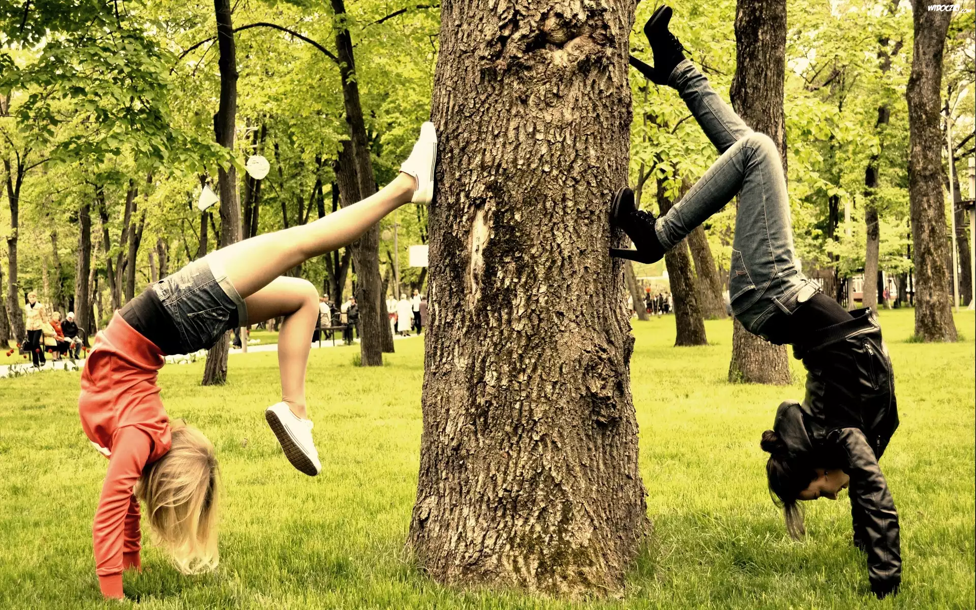 Zdjęcia, Park, Dwie, Kobiety, Stójka, Na, Rękach