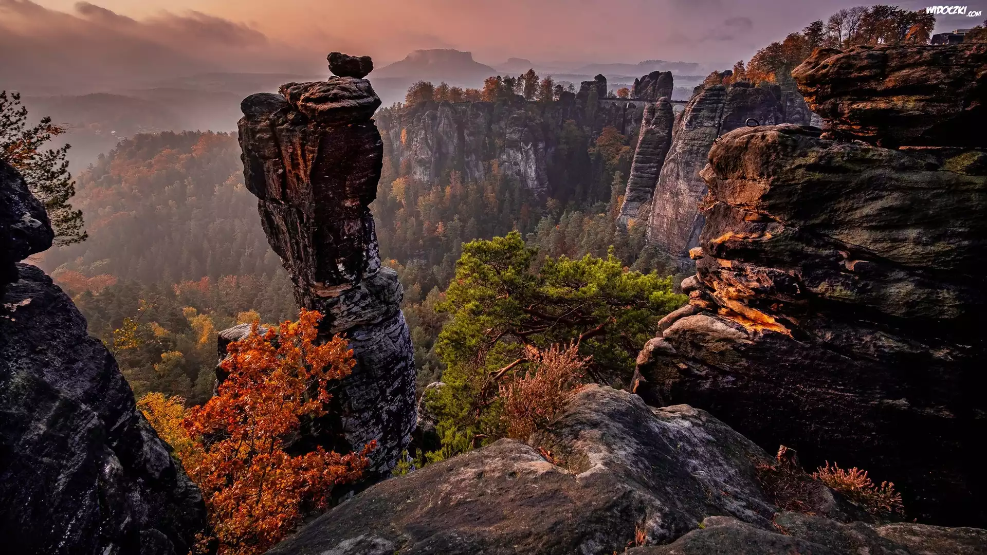 Formacja skalna, Bastei, Skały, Góry, Drzewa, Park Narodowy Saskiej Szwajcarii, Niemcy