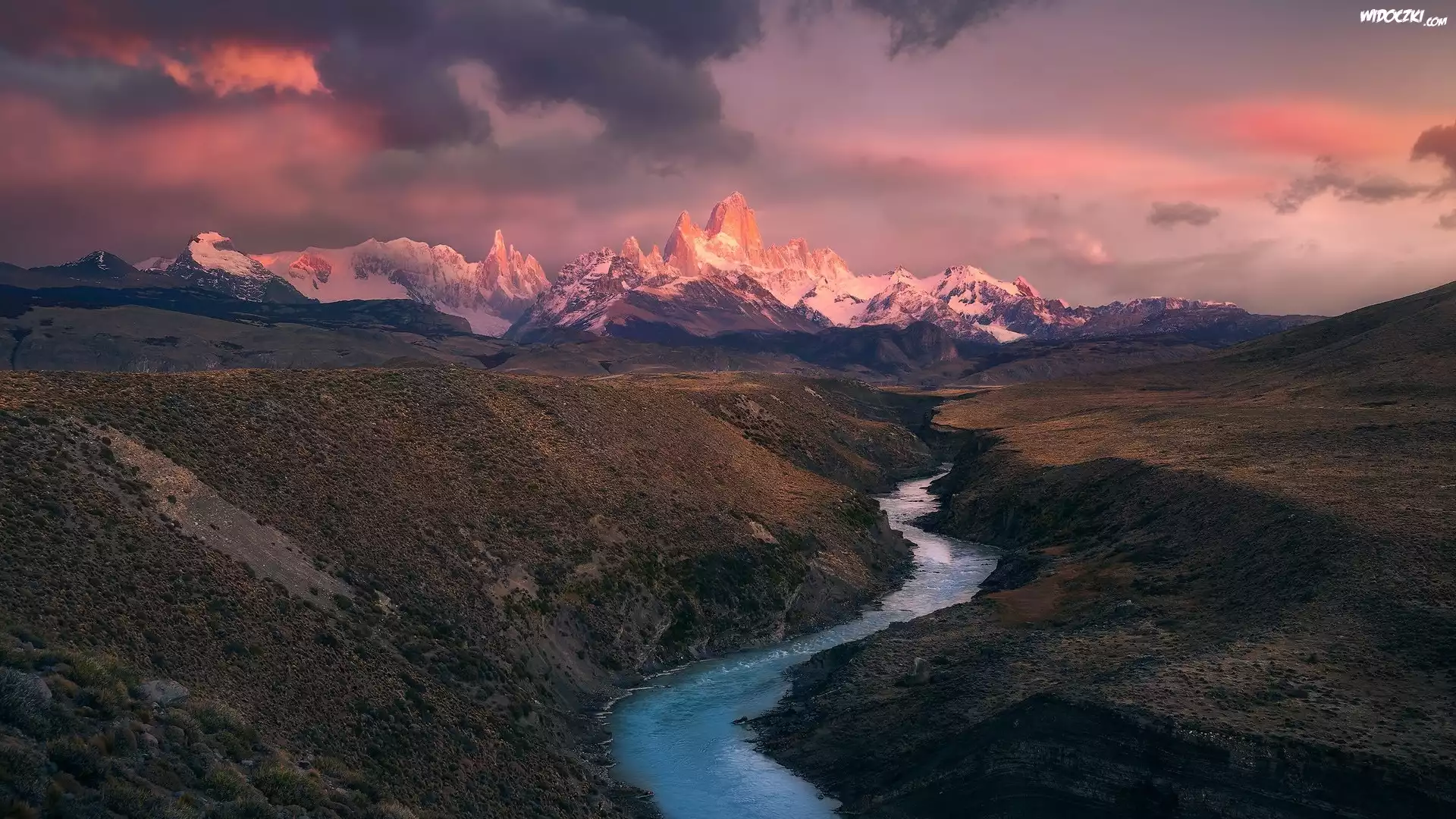 Zdjęcia, Wschód słońca, Góry, Chmury, Rzeka, Skarpa, Park Narodowy Los Glaciares, Argentyna