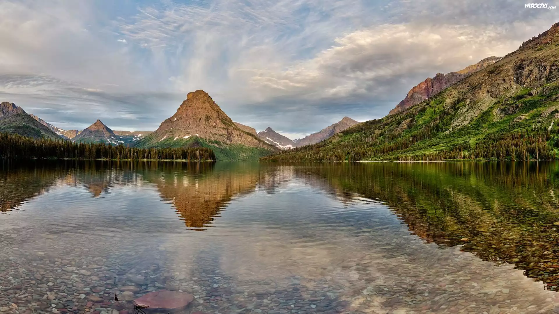 Park Narodowy Glacier, Góry, Góra, Sinopah Mountain, Jezioro, Two Medicine Lake, Drzewa, Odbicie, Chmury, Stan Montana, Stany Zjednoczone |