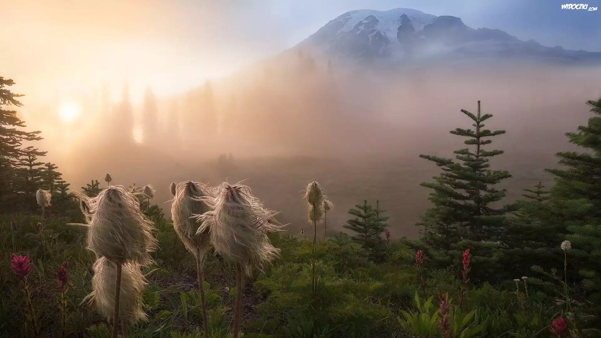 Park Narodowy Mount Rainier, Rośliny, Miądrzyga, Góra, Stratowulkan Mount Rainier, Drzewa, Przebijające światło, Mgła, Stan Waszyngton, Stany Zjednoczone |