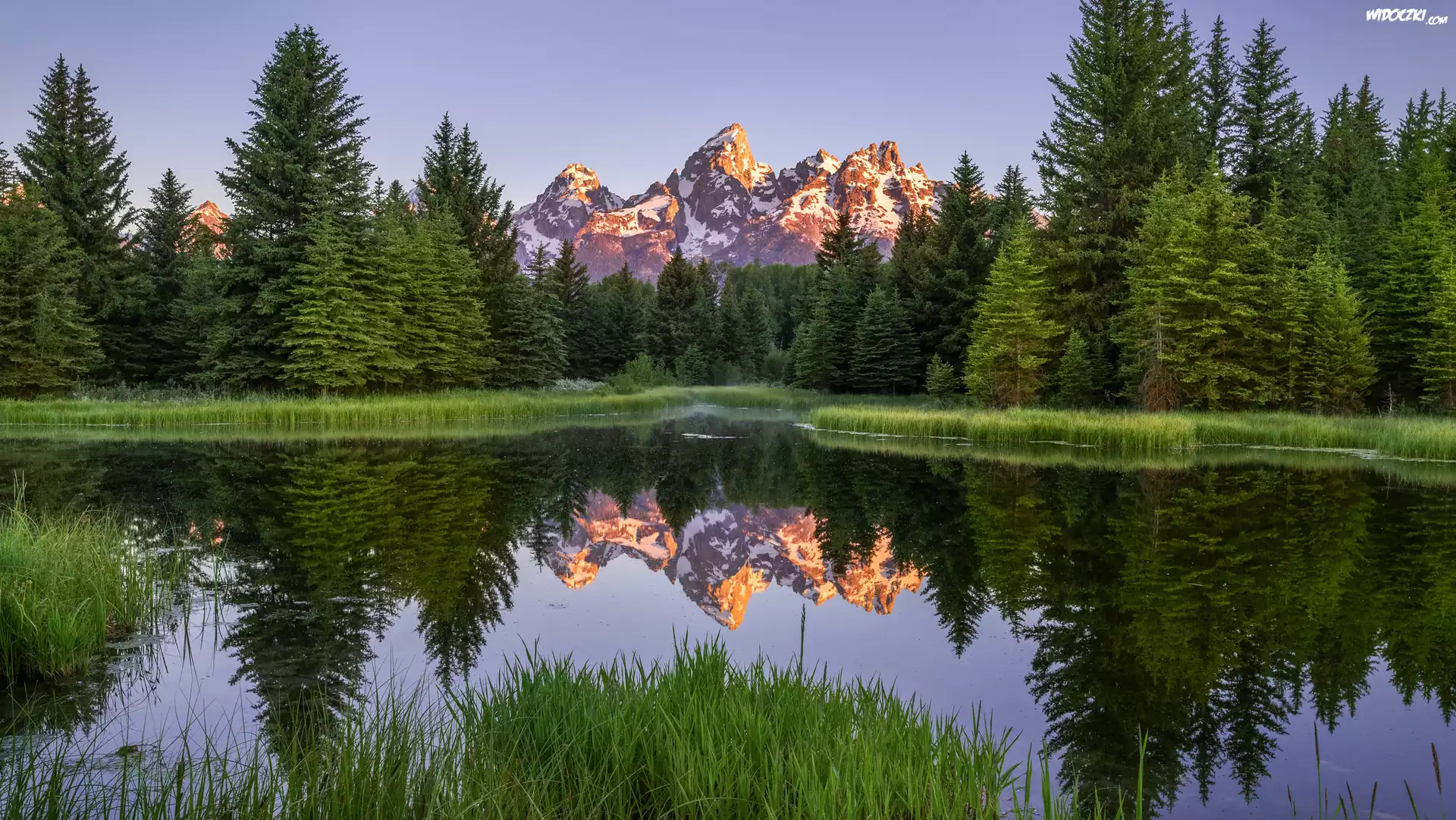 Park Narodowy Grand Teton, Góry, Teton Range, Las, Drzewa, Odbicie, Rzeka Snake River, Stan Wyoming, Stany Zjednoczone |
