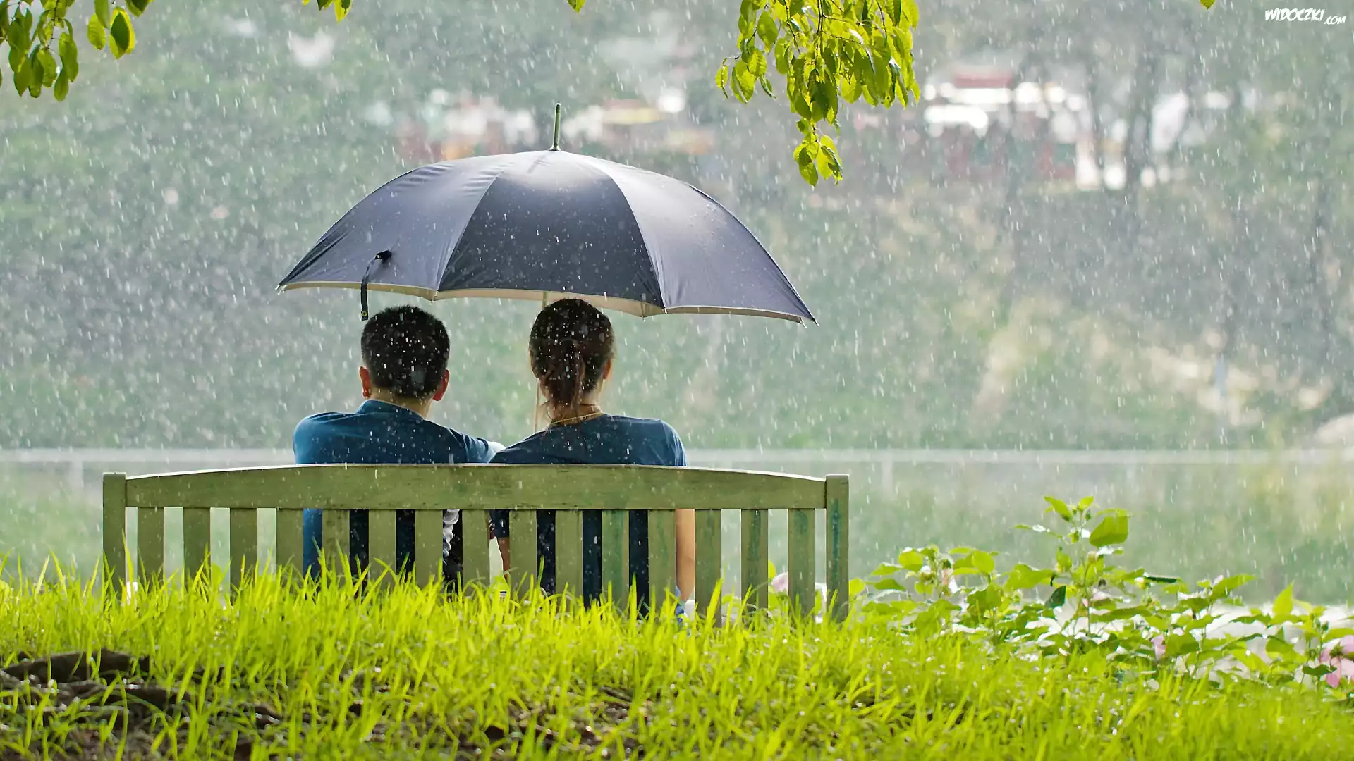 Zdjęcia, Park, Deszcz, Ławka, Para, Parasol