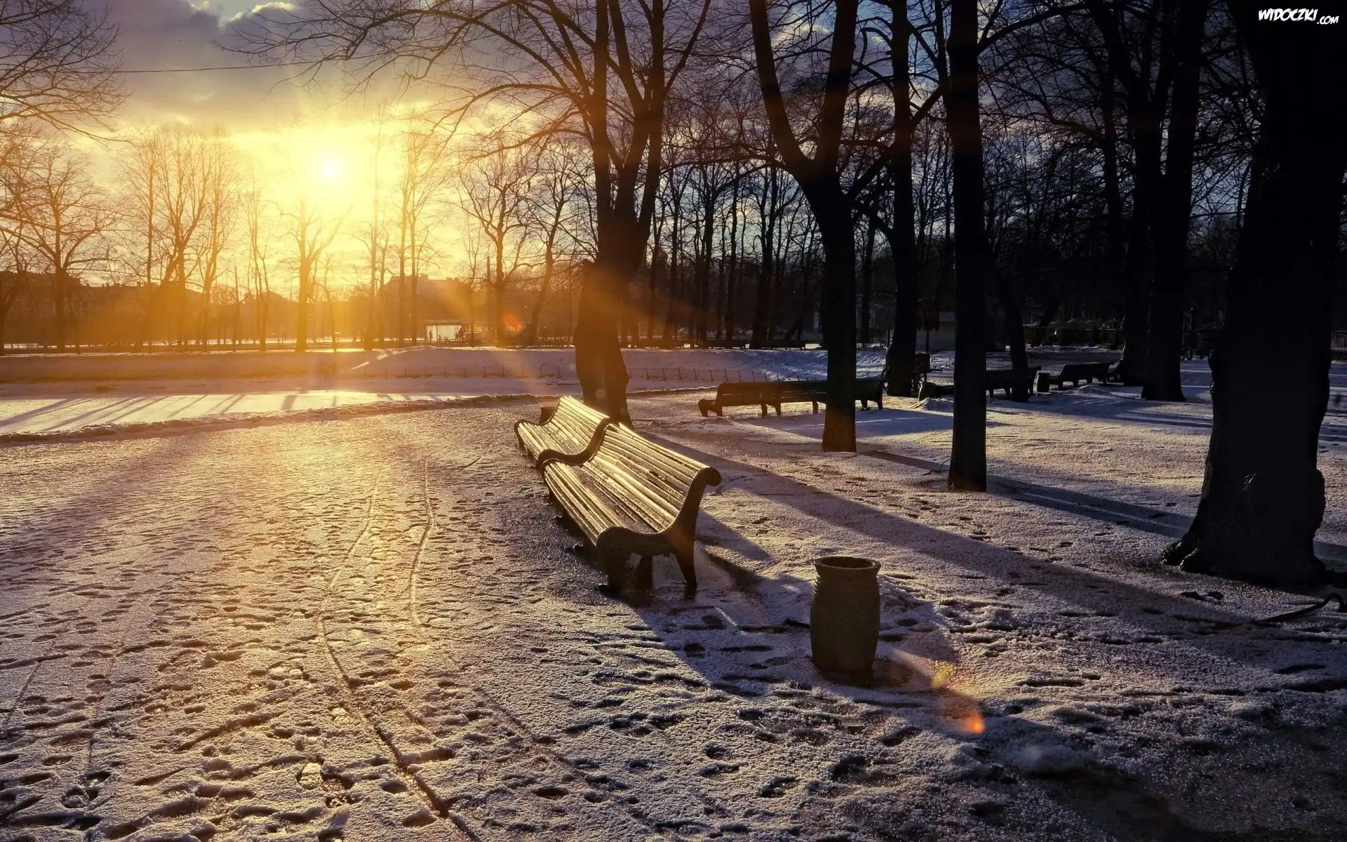 Zdjęcia, Park, Zima, Staw, Ławki, Promienie, Słońca