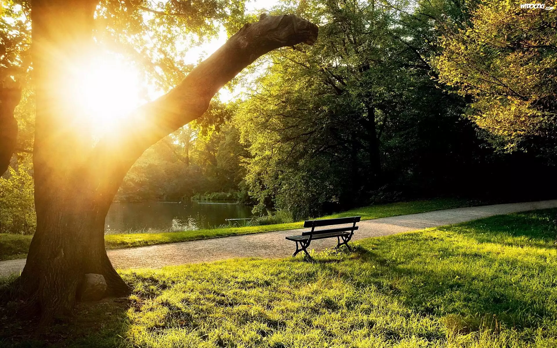 Park, Ławka, Przebijające, Słońce