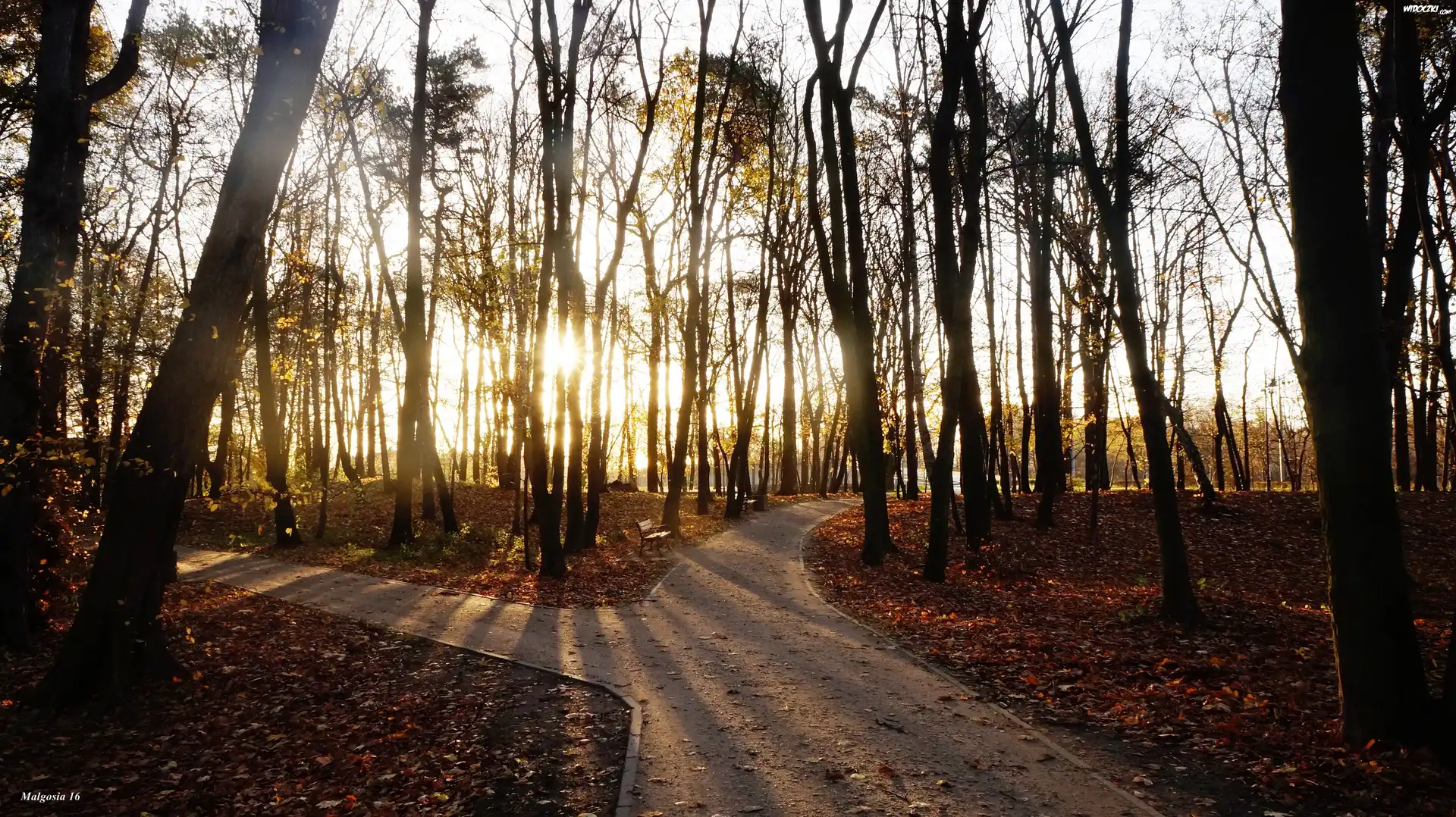 Zdjęcia, Park, Alejki, Drzewa, Jesień, Przebijające Światło
