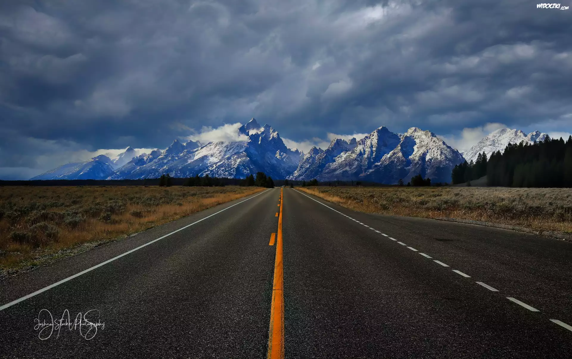 Zdjęcia, Stany Zjednoczone, Wyoming, Park Narodowy Grand Teton, Góry Teton Range, Trawa, Droga, Chmury