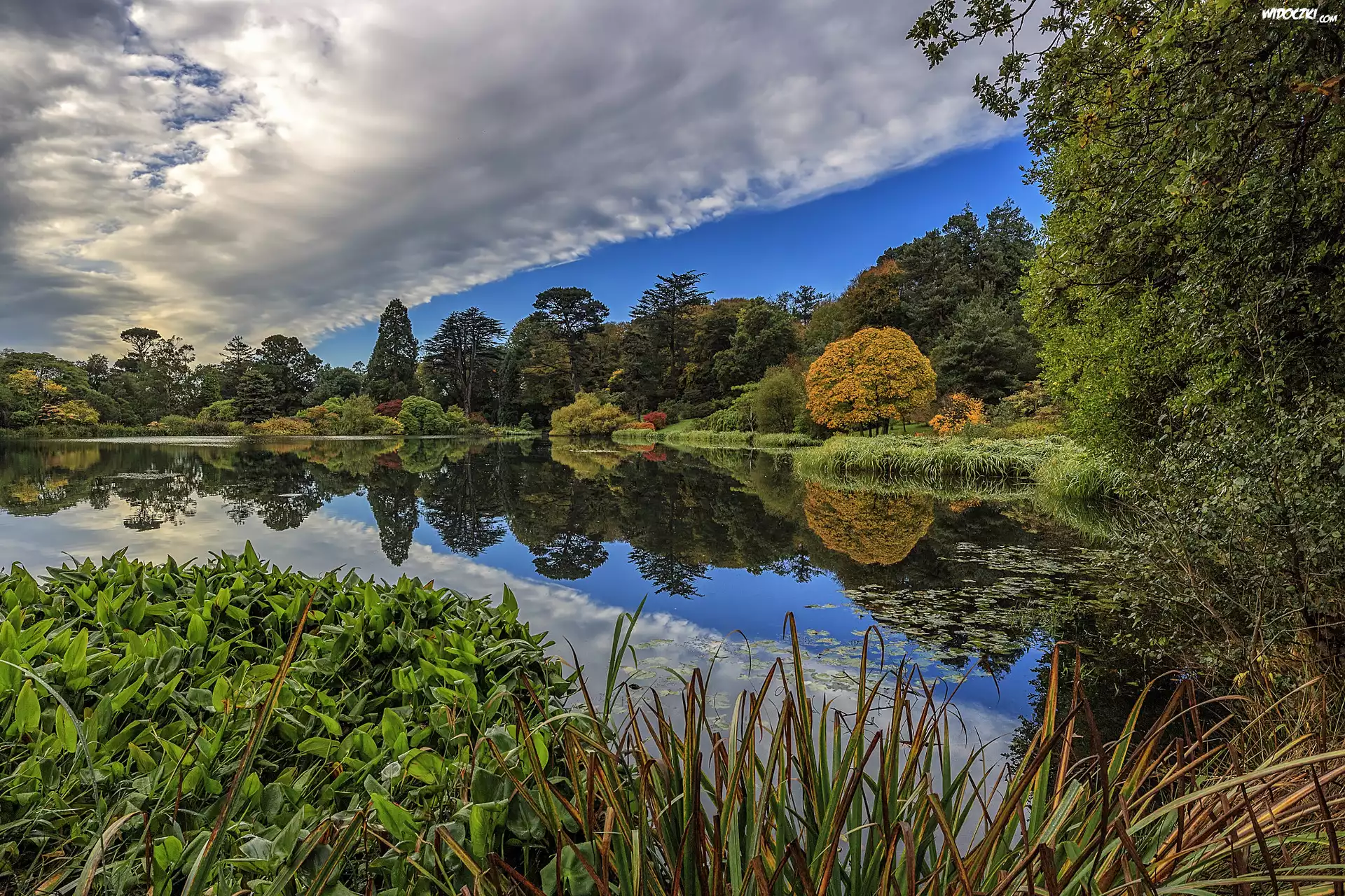 Park, Jezioro, Drzewa, Roślinność, Chmury