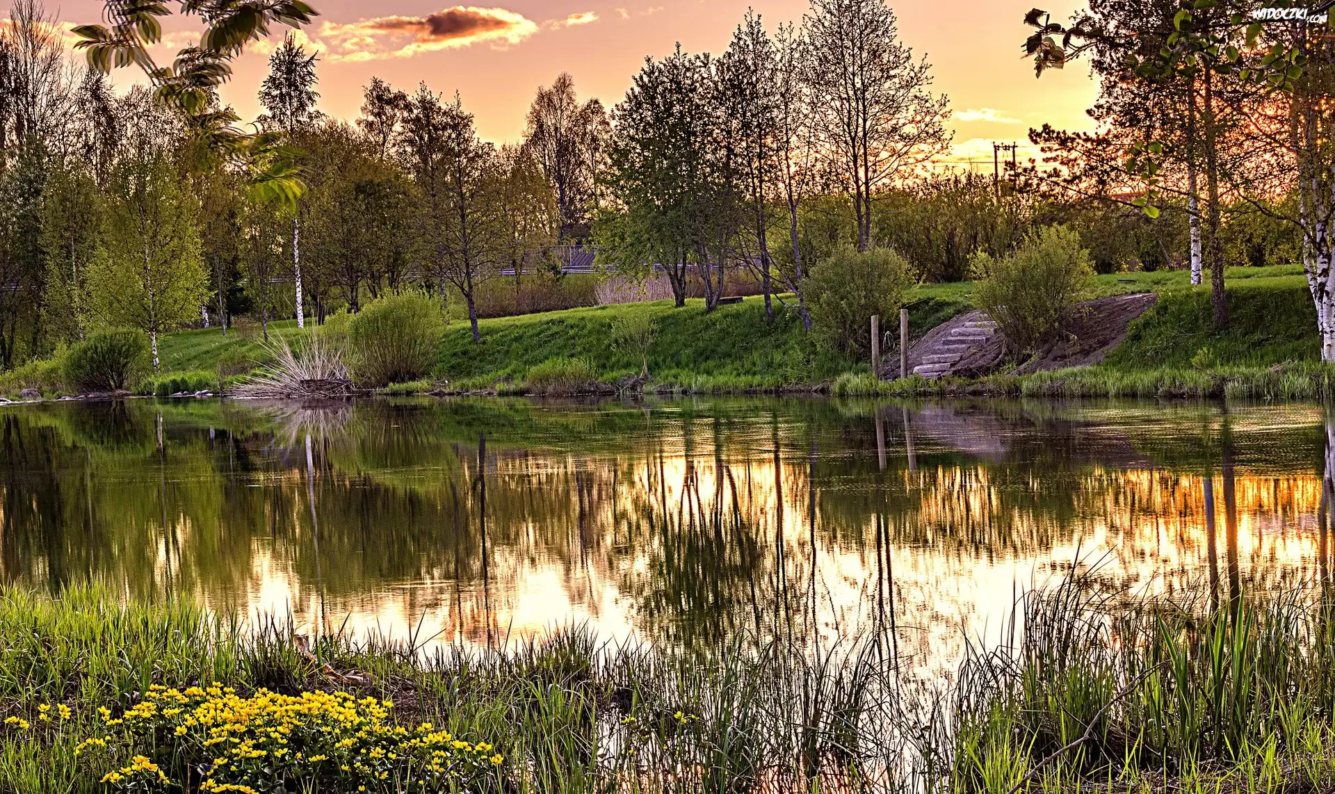 Zdjęcia, Park, Staw, Drzewa, Schody, Rośliny, Odbicie