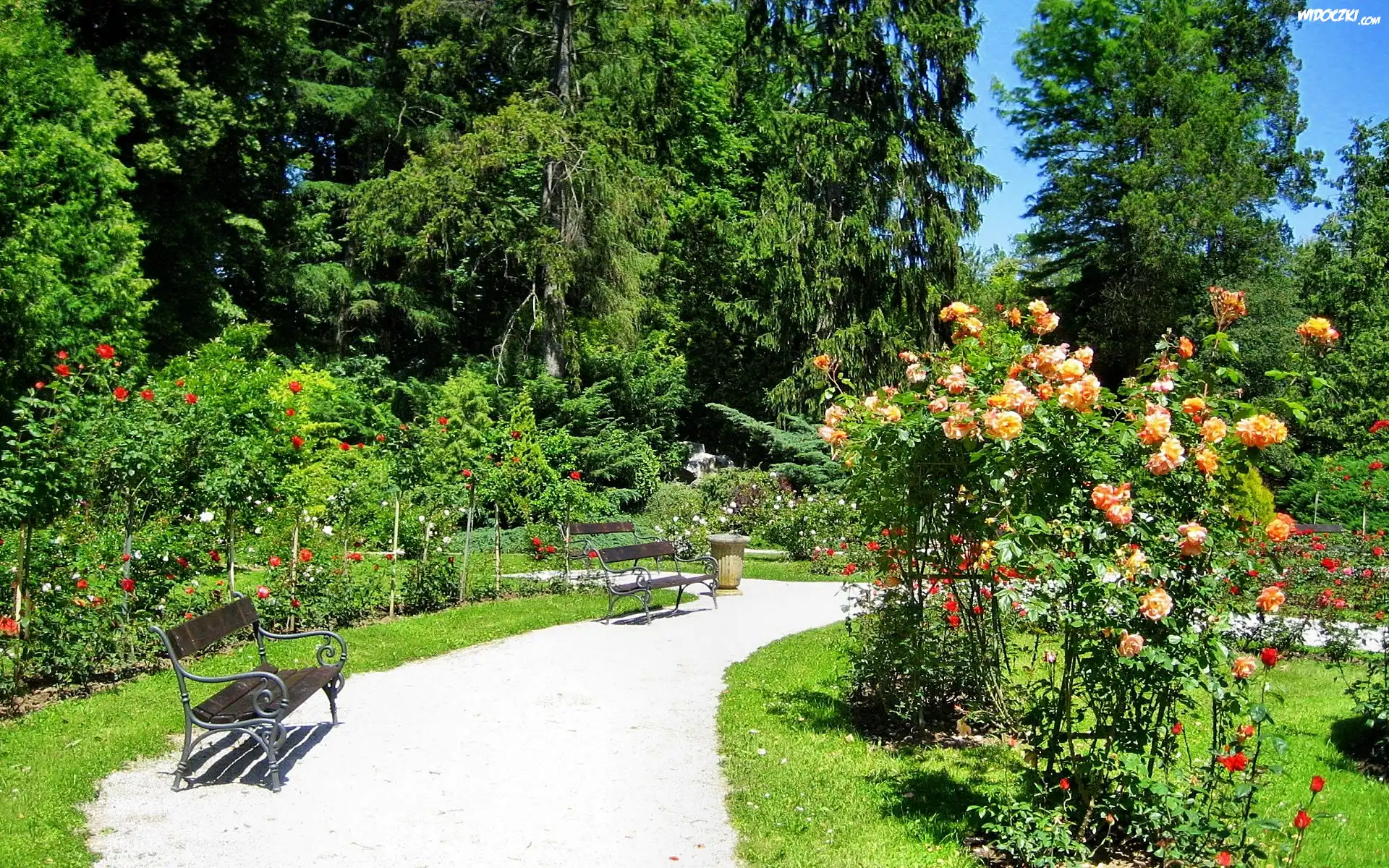 Zdjęcia, Park, Ławeczki, Kwitnące, Róże, Lato