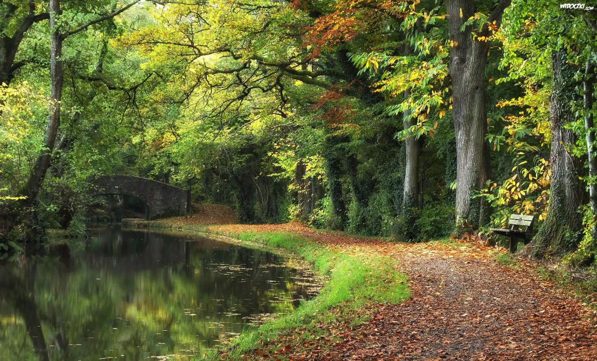 Park, Drzewa, Aleja, Ławka, Rzeka, Most