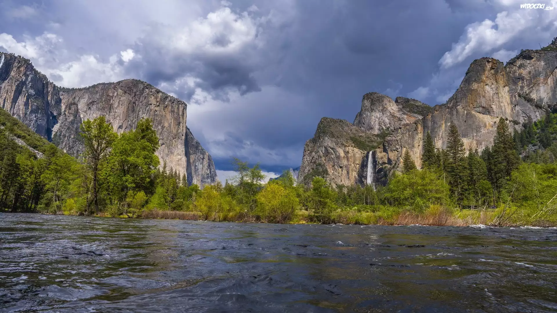 Stany Zjednoczone, Kalifornia, Park Narodowy Yosemite, Góry, Niebo, Chmury, Rzeka, Merced River, Drzewa