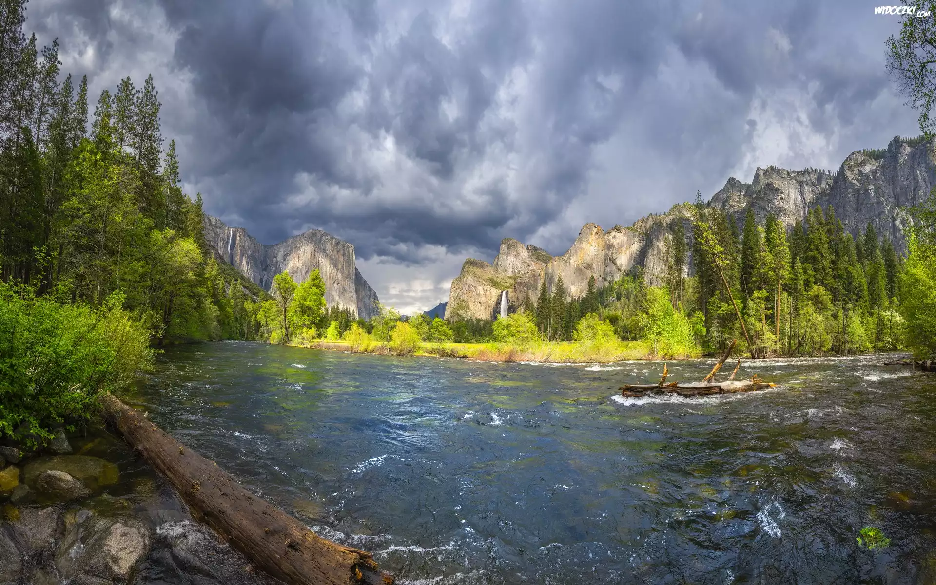 Stany Zjednoczone, Kalifornia, Park Narodowy Yosemite, Góry, Niebo, Chmury, Rzeka, Merced River, Drzewa |