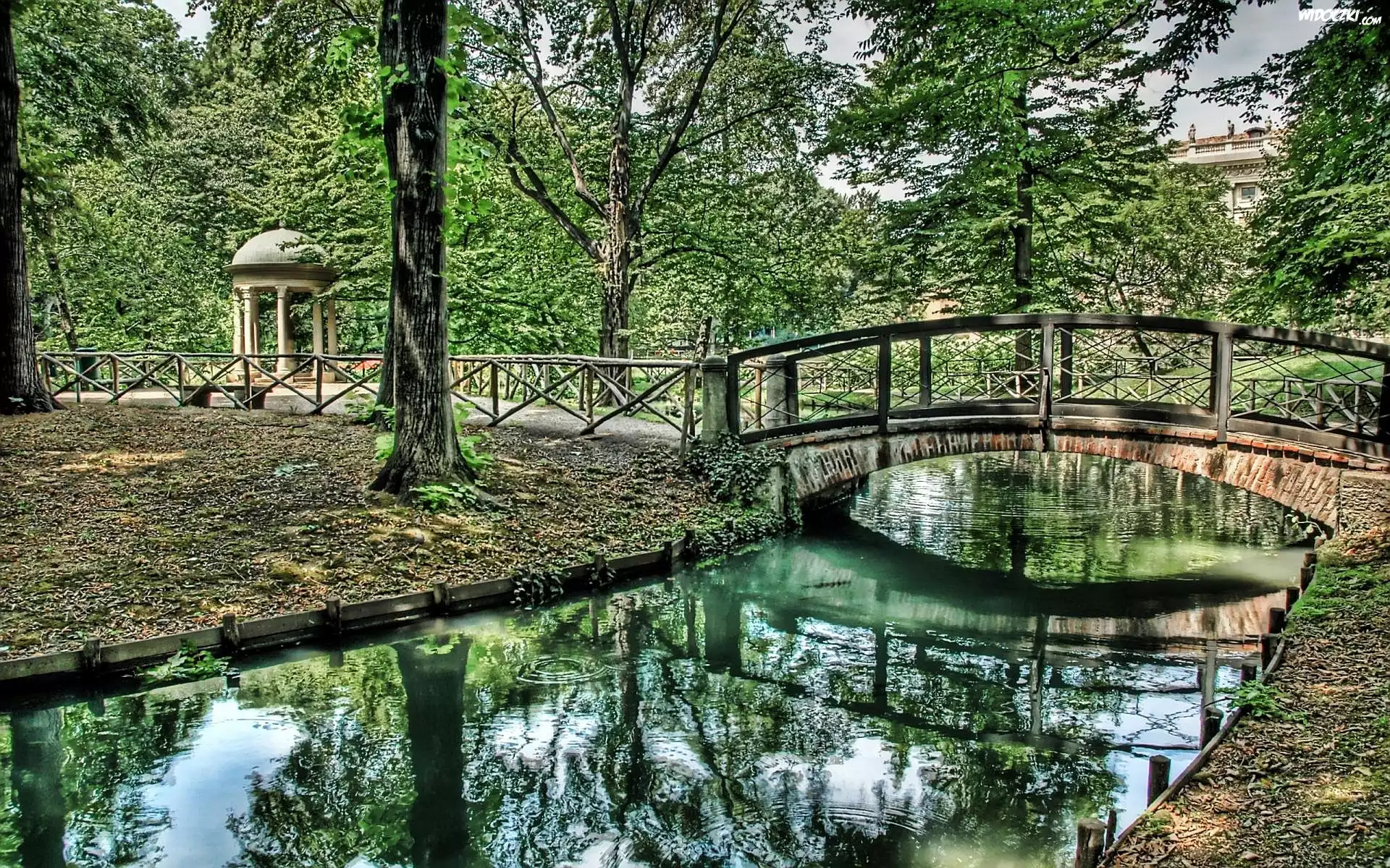 Zdjęcia, Park, Drzewa, Most, Rzeka, Odbicie