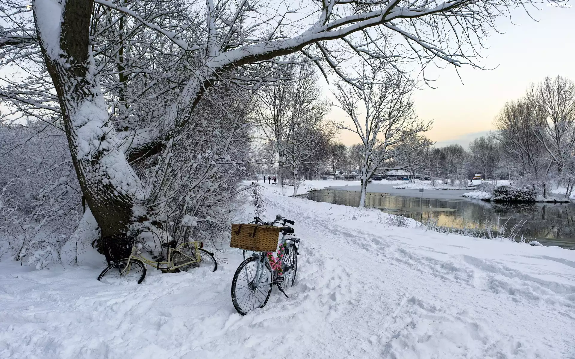 Zdjęcia, Park, Śnieg, Rzeka, Rowery