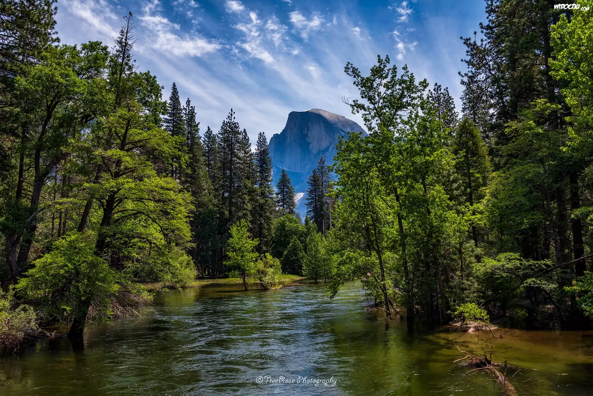 Góry, Szczyt Half Dome, Rzeka, Merced River, Drzewa, Park Narodowy Yosemite, Kalifornia, Stany Zjednoczone |